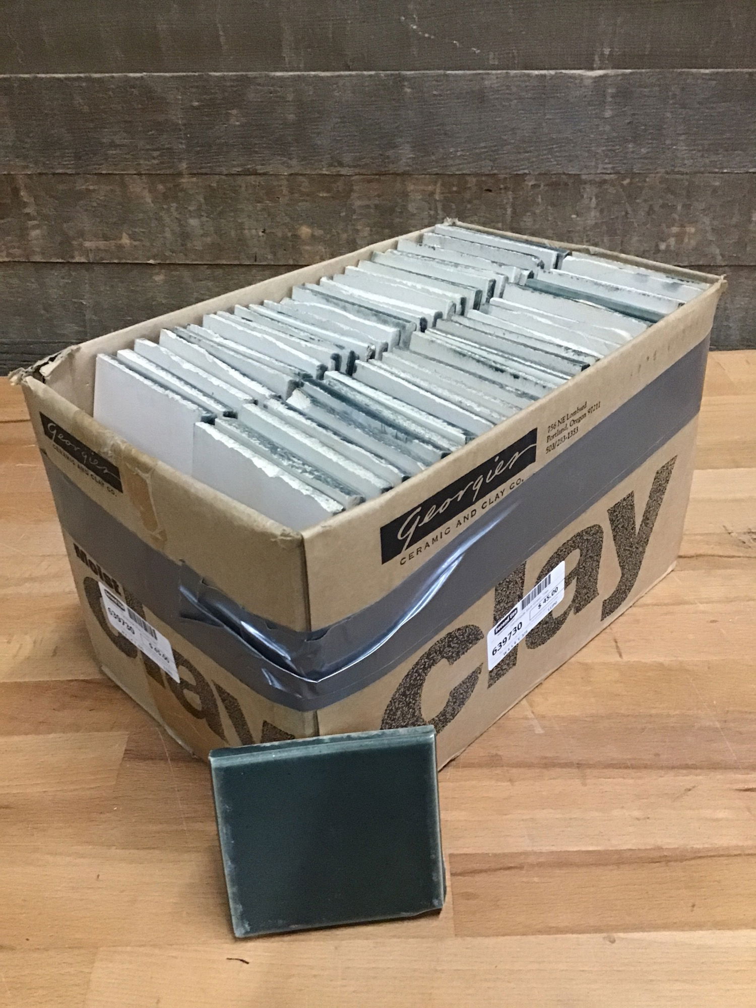 Box of about 104 4"x4" locally handmade blue-green tiles. Price reflects that a few of the tiles are chipped.