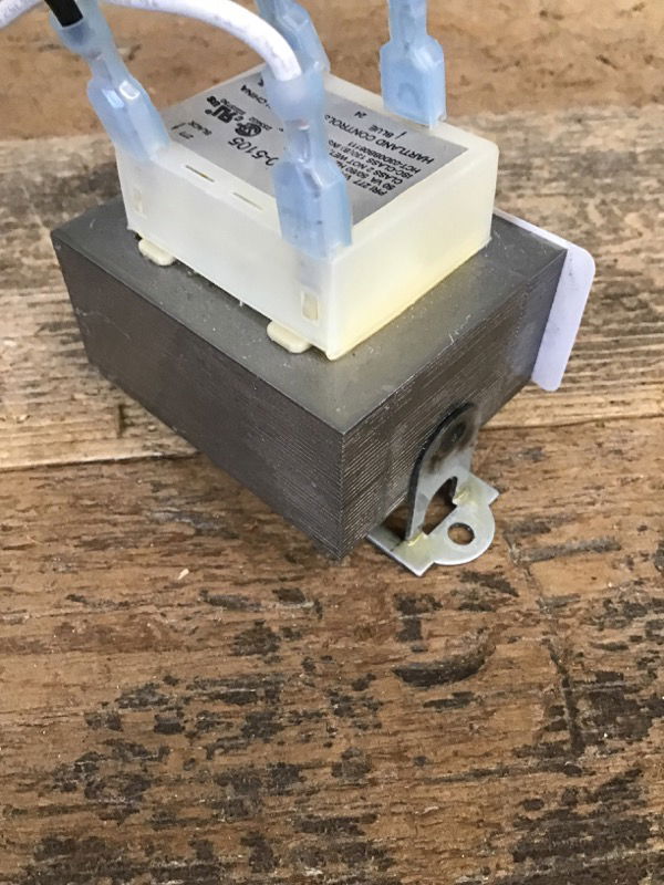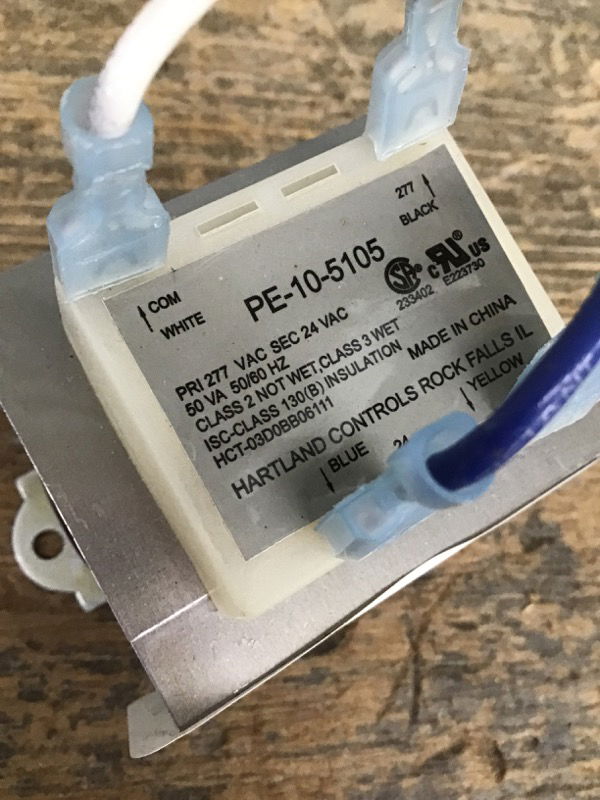 Hartland Controls brand transformer that appears unused, model PE-10-5105. Specs: PRI 277 VAC SEC 24 VAc, 50 VA 50/60 HZ, Class 2 not wet, class 3 wet, isc-class 130(b) insulation.