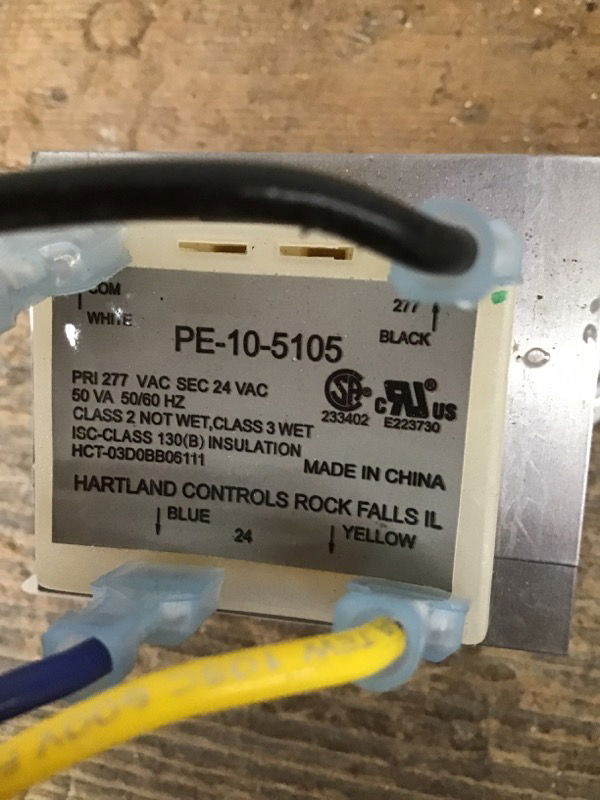 Hartland Controls brand transformer that appears unused, model PE-10-5105. Specs: PRI 277 VAC SEC 24 VAc, 50 VA 50/60 HZ, Class 2 not wet, class 3 wet, isc-class 130(b) insulation.