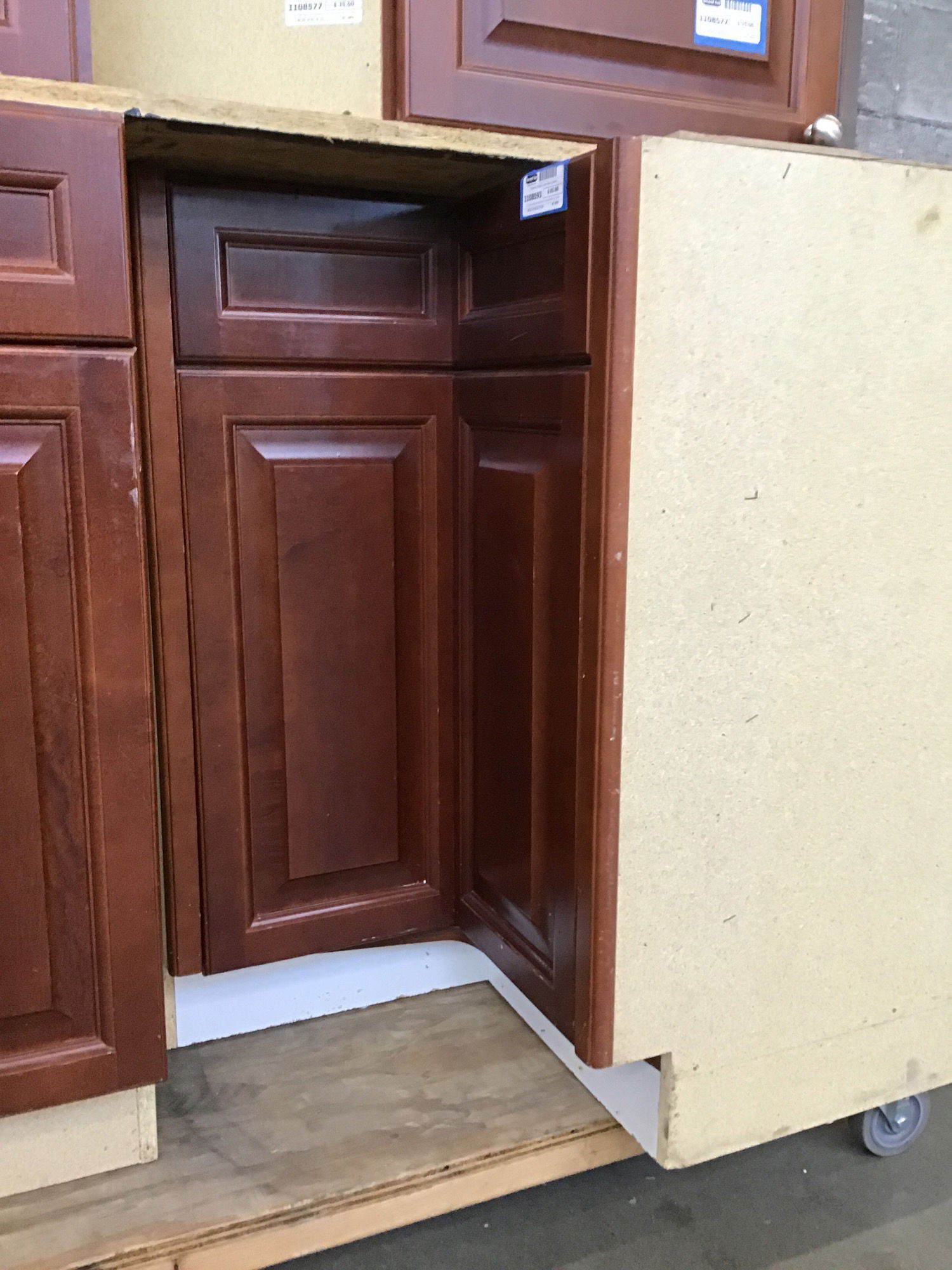 Ca. 2008 raised panel maple corner base cabinet in a "Hazelnut" stained finish. This has a 2-tier lazy susan behind the one door. It's a little greasy but will be a fine cabinet with a good scrub and a fresh knob.