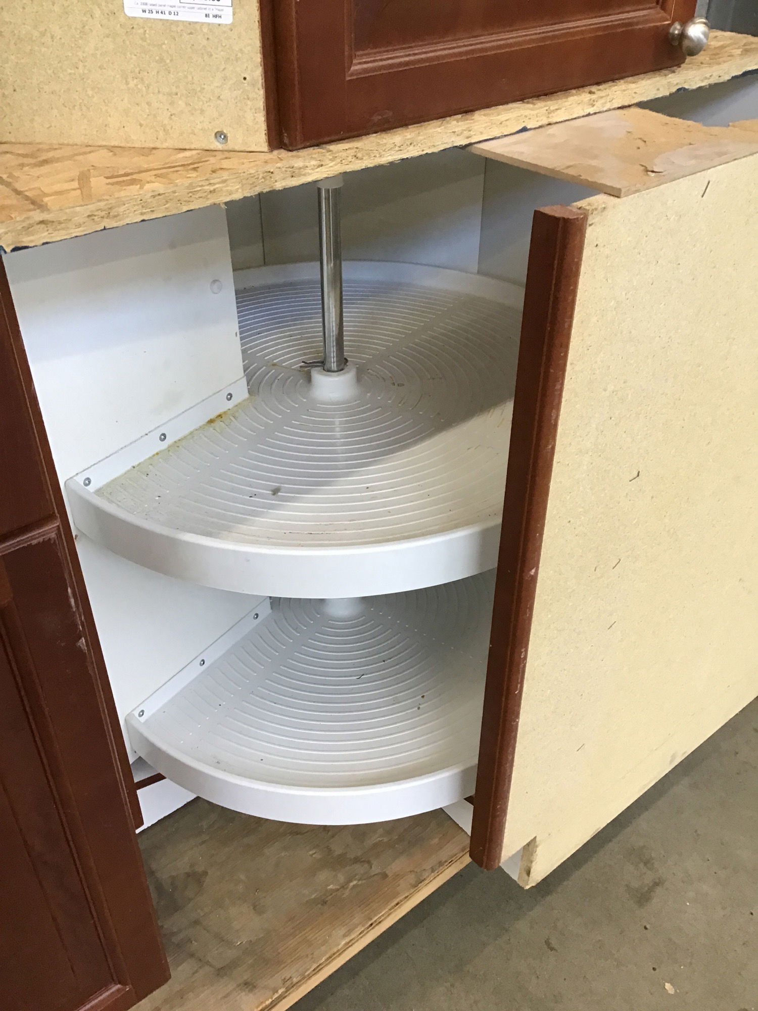Ca. 2008 raised panel maple corner base cabinet in a "Hazelnut" stained finish. This has a 2-tier lazy susan behind the one door. It's a little greasy but will be a fine cabinet with a good scrub and a fresh knob.