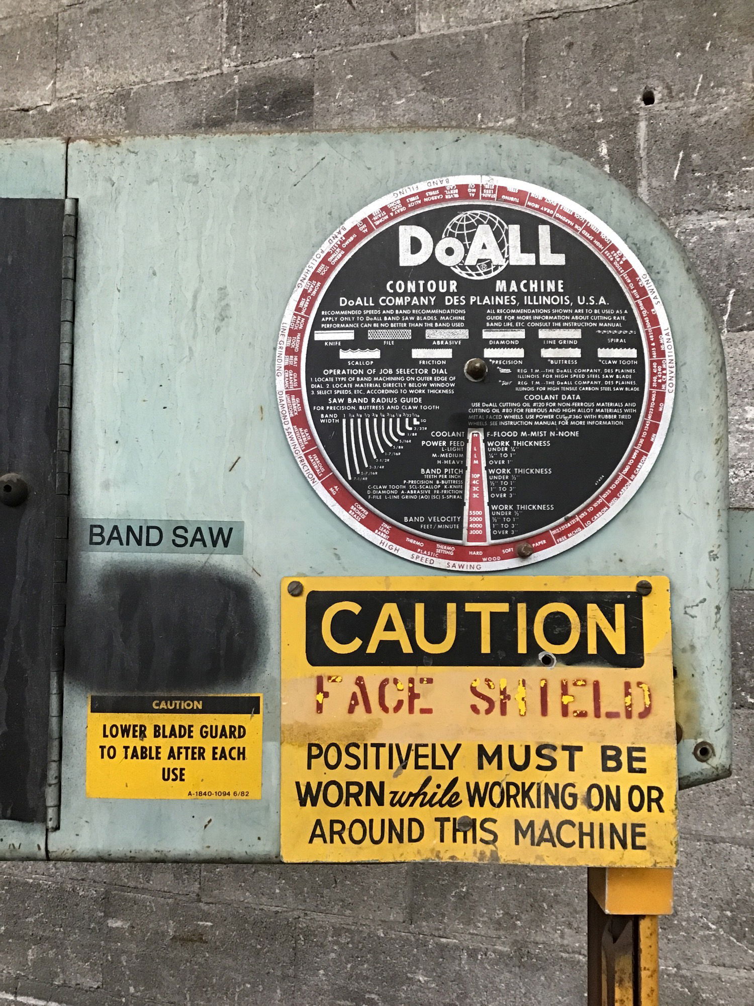 Absolute unit of a bandsaw with a great patina and so many cool warning labels it might as well be playing the Shaking Hands With Danger bass riff. Would make for a super sweet conversion into a bar or room divider. Takes three phase power, so we were unable to test in house. USE AT YOUR OWN RISK!