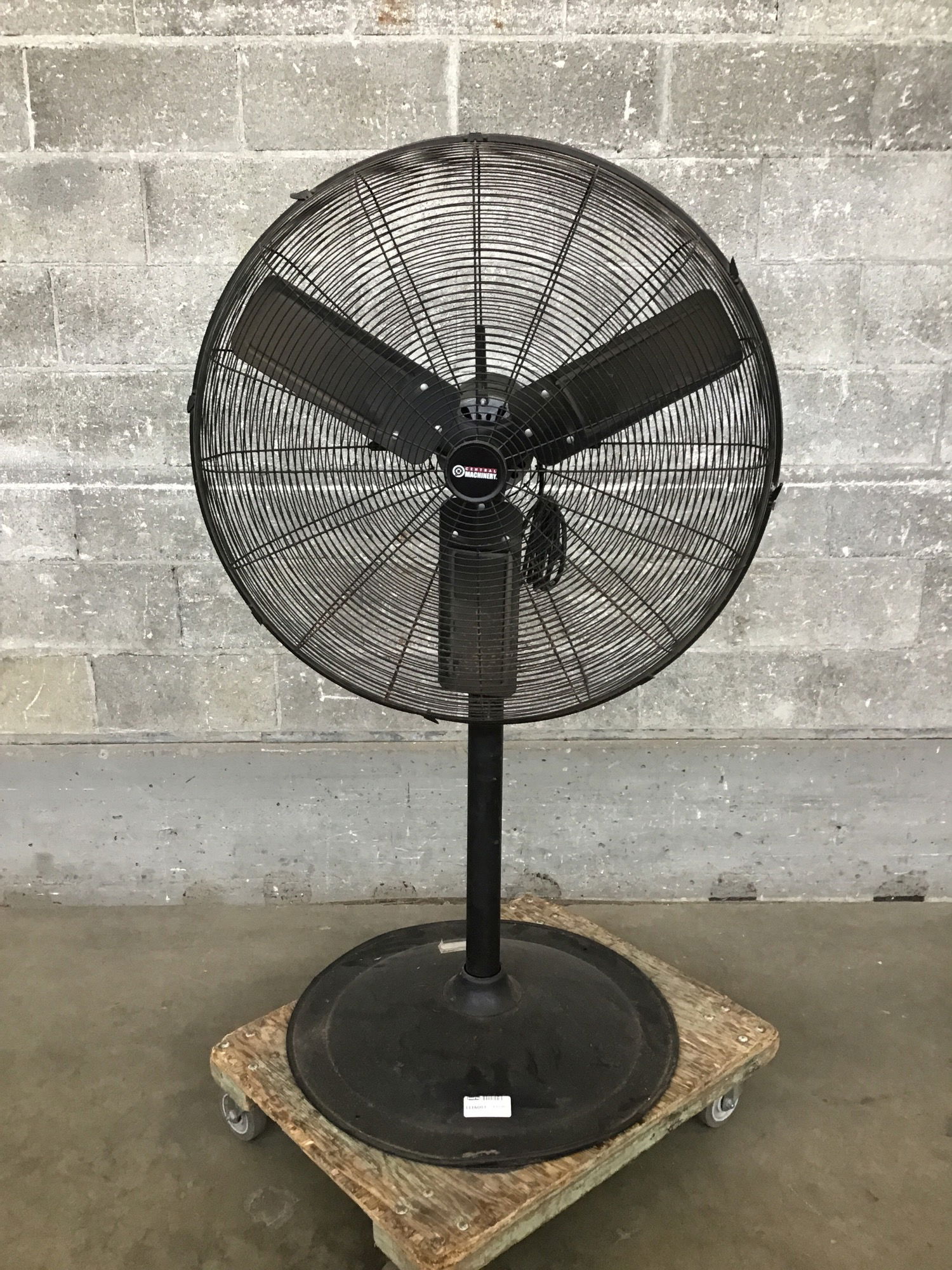 From Central Machinery, this large industrial fan offers a heavy weighted base, an ~28" fan and a few different speeds. This is ideal for warehouses, back porches and DIY hover craft. Some dust. Bracket to raise and lower is cracked. Appeared to function when tested