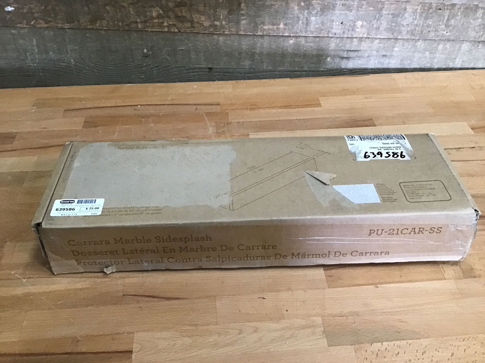 Model #PU-21CAR-SS Natural Italian Carrara Marble Side Splash. New in-box, left or right placement side splash. Coordinates with Roveland, Canterbury, Crest Hill, Brawley, Watson and Brookview collections. Engineered versions retail for $50, but this is a nicer natural marble.