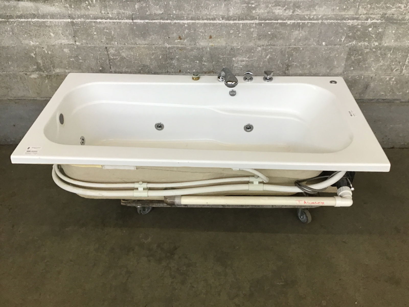 Jetted bathtub with filler faucet as well as handheld shower head. Faucets are on the long side of the tub so they don't jut into your back while you're taking a nice, relaxing bath. This one comes with the pump, though it is sold untested.