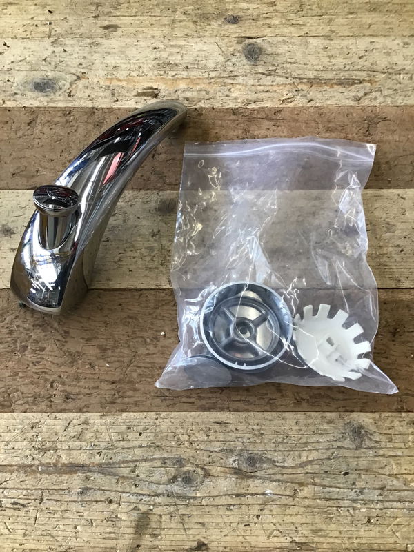 Jetted bathtub with filler faucet as well as handheld shower head. Faucets are on the long side of the tub so they don't jut into your back while you're taking a nice, relaxing bath. This one comes with the pump, though it is sold untested.