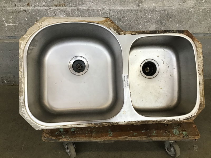 A nice kitchen sink, no branding on it. Stainless steel, good, durable built. The two basins are slightly differently sized, one measures only around 18.375" deep.