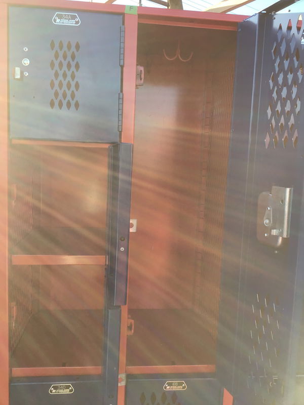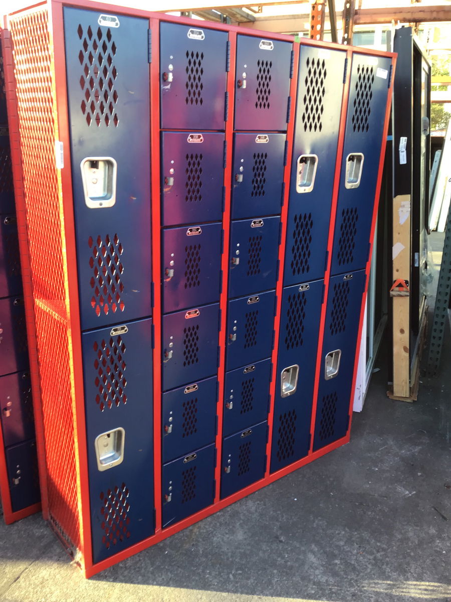 Gym lockers from Lindbergh High School in Renton. The small doors on this unit are 10 1/4" wide x 11 7/8" tall. The larger doors are 10 1/4" x 35 3/4" tall. Dimensions for the unit may vary slightly. Photo may be representational.