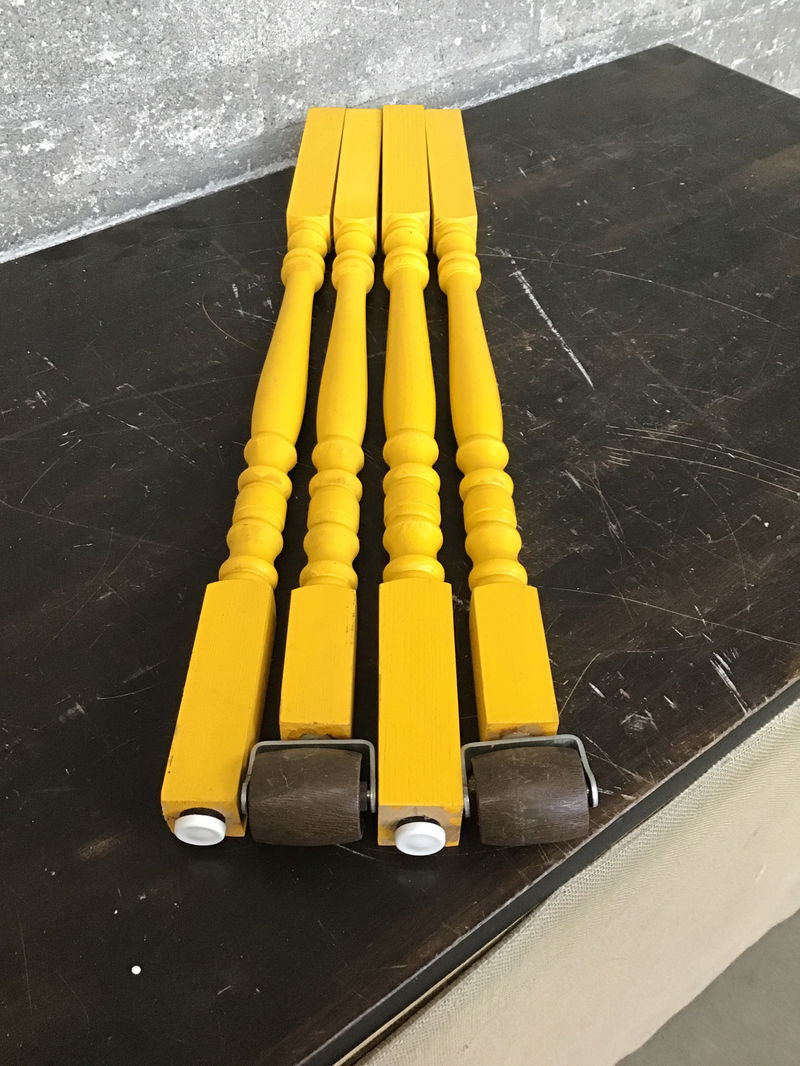 Leftover from a table project, this set includes four coverted baluster table legs, a Velveeta-like yellow finish and a pair of wheels of two of the legs.