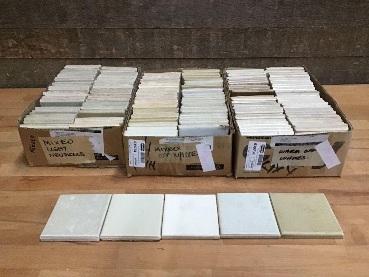 Three boxes of 4"x4" ceramic tiles, locally handmade in the '90s. These are a mix of light-neutral and off-whites that go really well together. Total of 165 tiles.