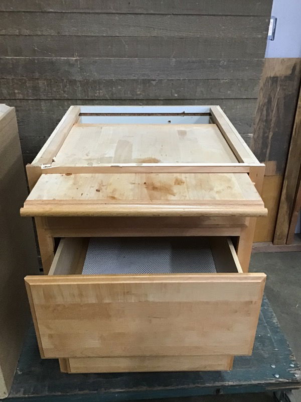 Every kitchen needs more drawers! This 3-drawer base cabinet has a Maple face on particle board box. Drawers slide well and cabinet is in good used condition. Also has a cutting board!