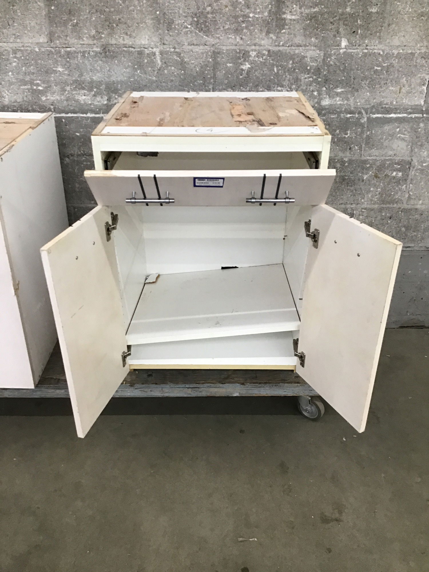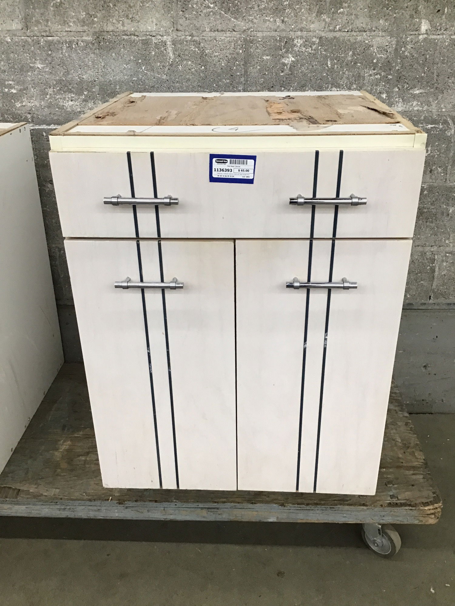 Flush face, white(ish) stained maple with black stripes Mod looking base cabinet. This one has reached a fork in the road - it looks like there was previously a pull-out cutting board behind the top door, but if you removed the hardware and cut a hole in the top it could become a sink base. The choice is yours. This has one adjustable shelf behind the doors.