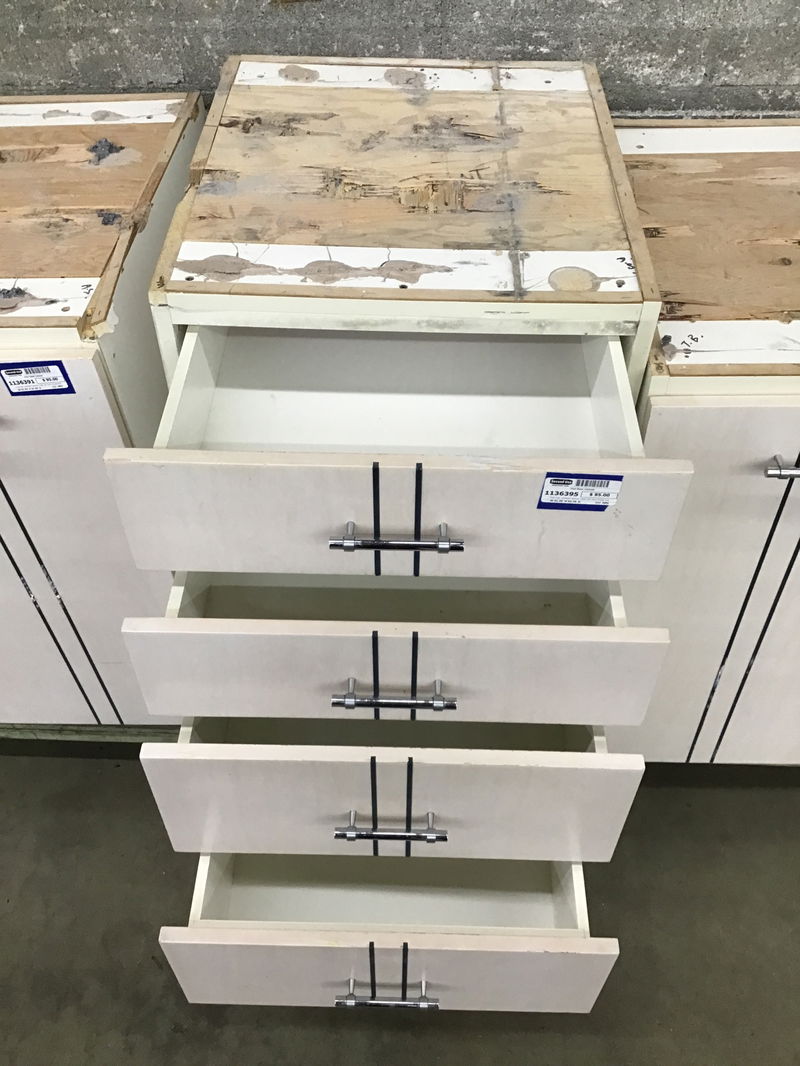 Flush face, white(ish) stained maple with black stripes Mod looking base cabinet. This one has four drawers and a slightly off kilter toe kick. Nothing a shim or two won't fix!