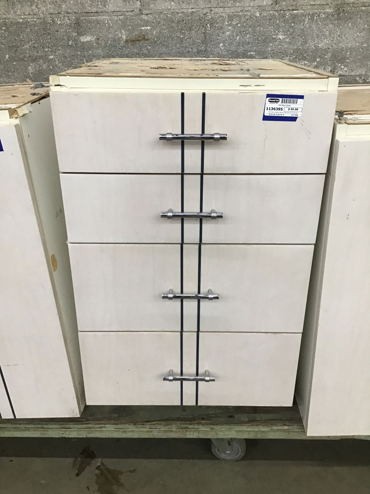 Flush face, white(ish) stained maple with black stripes Mod looking base cabinet. This one has four drawers and a slightly off kilter toe kick. Nothing a shim or two won't fix!