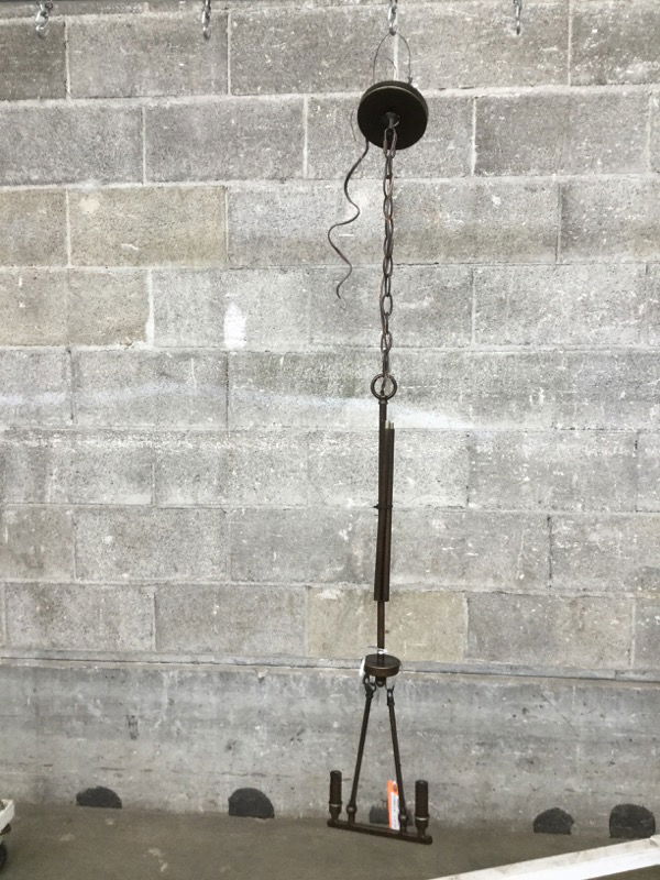 Neato minimalistic 2-light (candelabra socket) "chandelier" with an oil-rubbed bronze finish. Could be shortened or lengthened. Suitable for dry locations only. Dimensions are approximate. For more info, see this link.