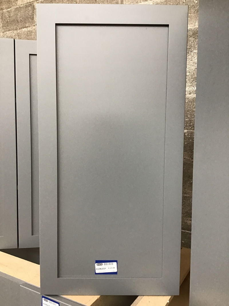 Brand new shaker style upper cabinet with a factory dolphin grey paint job, soft close hardware, and two adjustable shelves behind the door. This is a well constructed cabinet with a clean, modern look - a great option for giving your kitchen or laundry room a fresh look.