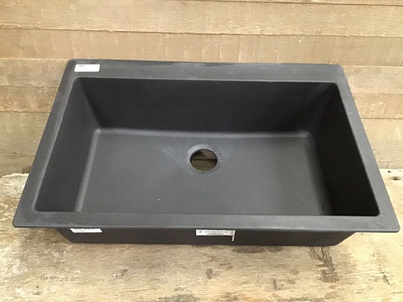 New out of box Franke composite kitchen sink with a speckled black granite finish, looks like it could be either drop-in/surface mount or undermount. No faucet holes cut yet, but comes with a diamond hole saw bit to drill your faucet holes. Nice, clean look. Bulk item, no holds, first come, first served. See more information here.