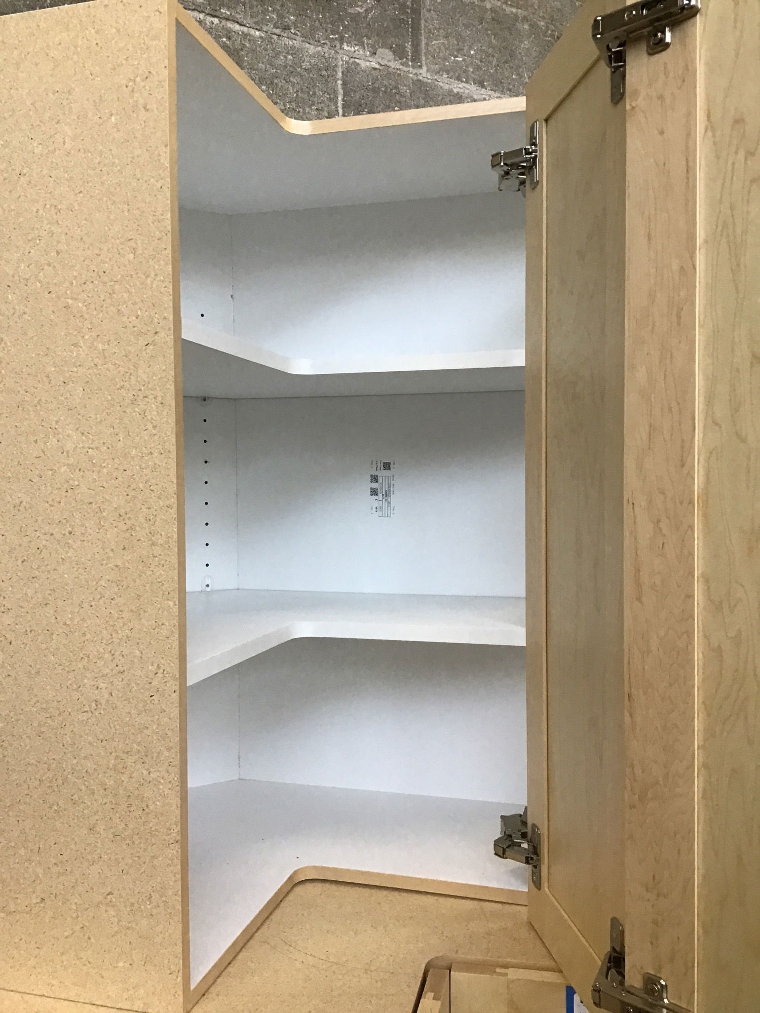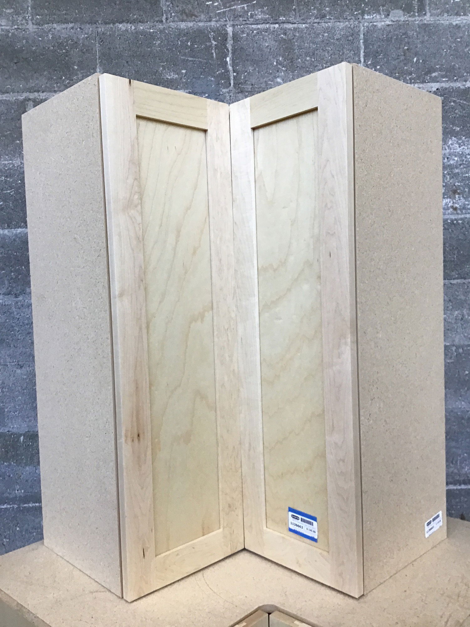 New shaker style upper corner cabinet with a clear finished solid maple face, soft close hardware, and two adjustable shelves behind the doors. This is a well constructed cabinet with a timeless look - a great option for giving your kitchen or laundry room a little refresh! Width listed is for the box - each door measures 12"W.