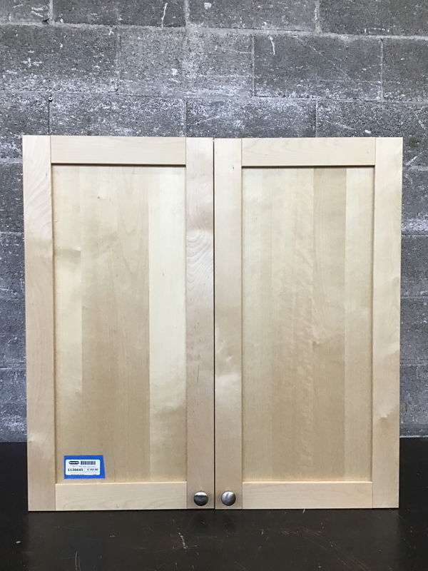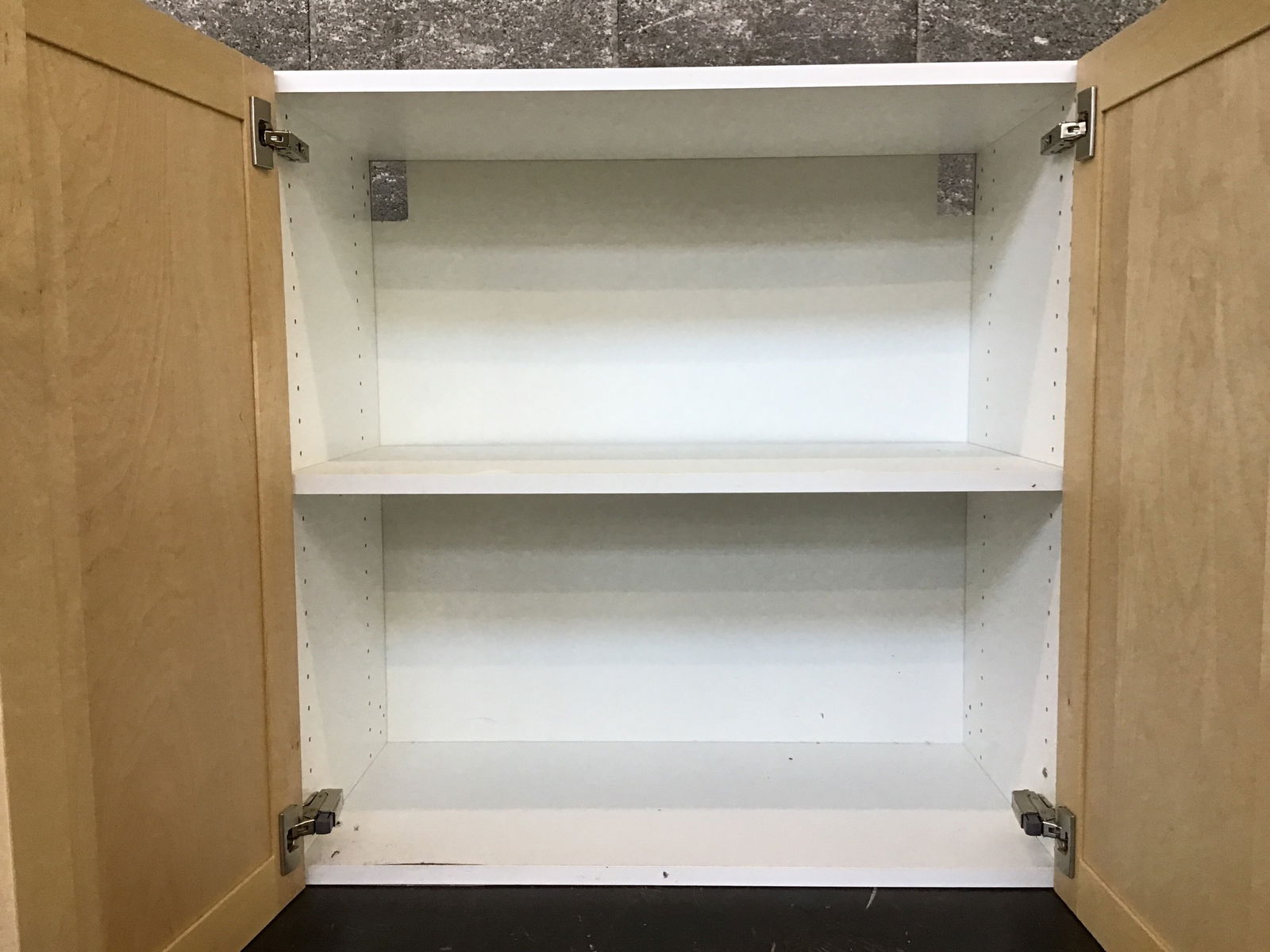 New shaker style upper cabinet with a clear finished solid maple face, soft close hardware, and one adjustable shelf behind the doors. This is a well constructed cabinet with a timeless look - a great option for giving your kitchen or laundry room a little refresh!
