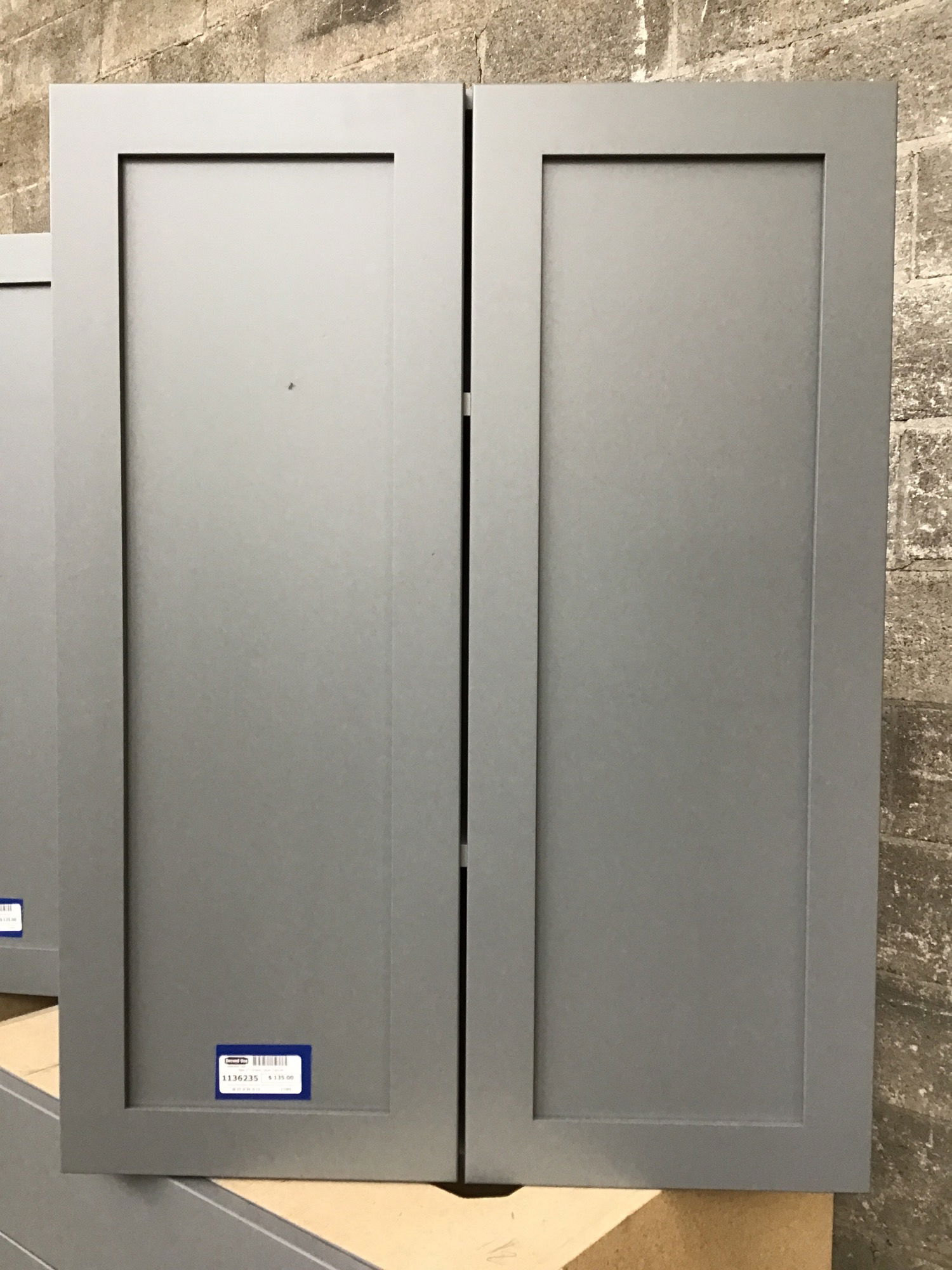 Brand new shaker style upper cabinet with a factory dolphin grey paint job, soft close hardware, and two adjustable shelves behind the doors. This is a well constructed cabinet with a clean, modern look - a great option for giving your kitchen or laundry room a fresh look.