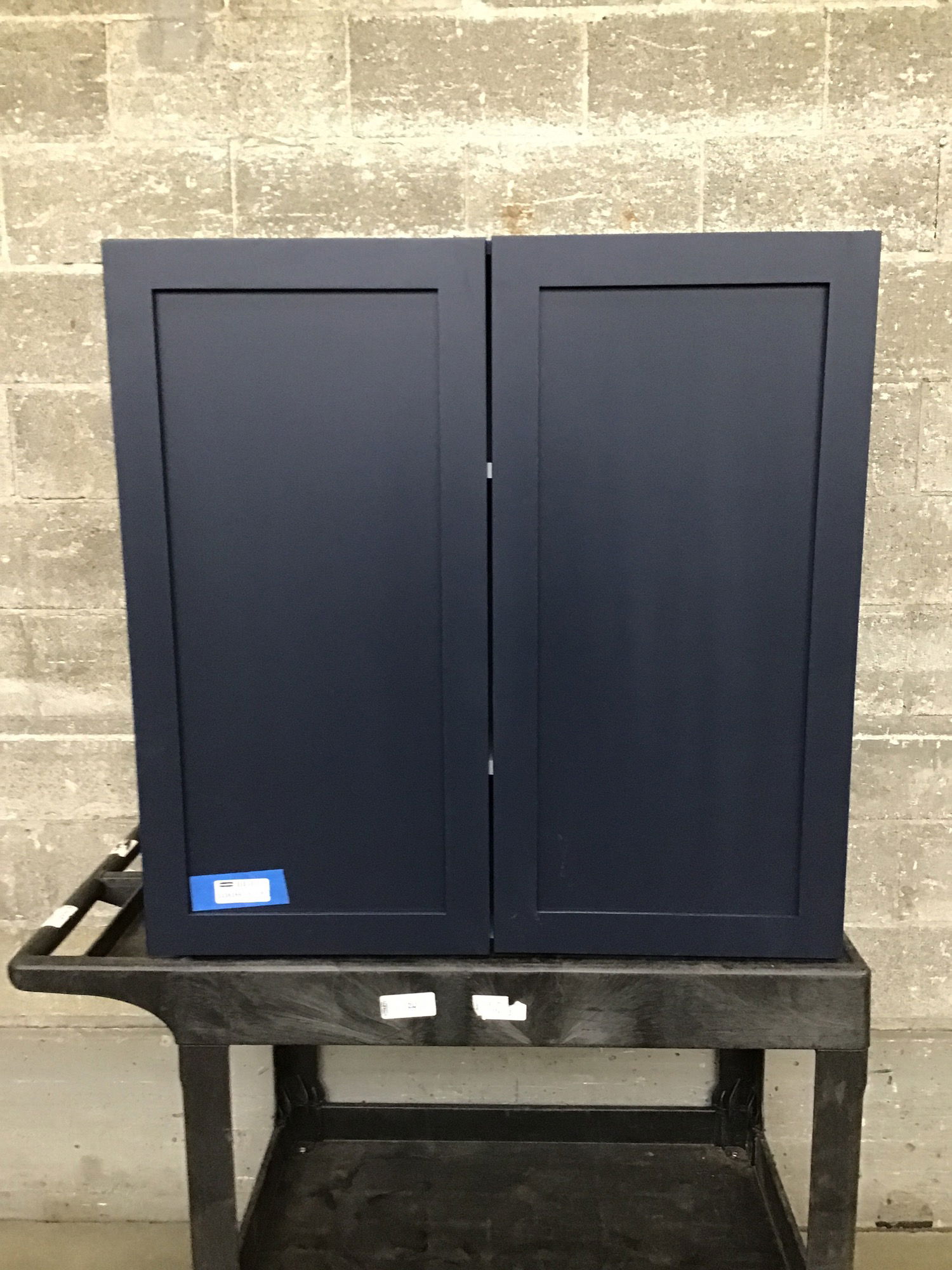 Brand new shaker style upper cabinet with a factory navy blue paint job, soft close doors, and two adjustable shelves. Does your remodel need a bit more? Check out other items from this job for matching cabinets and more!