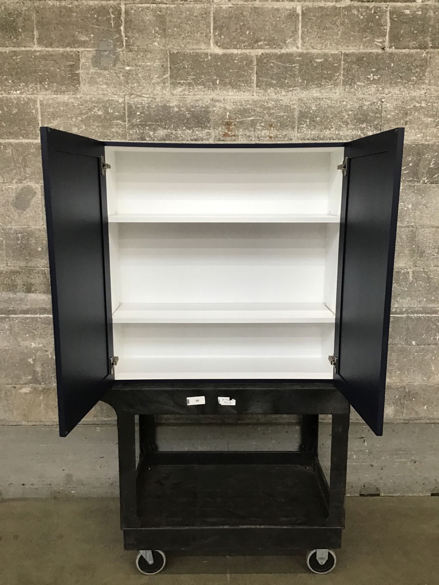 Brand new shaker style upper cabinet with a factory navy blue paint job, soft close doors, and two adjustable shelves. Does your remodel need a bit more? Check out other items from this job for matching cabinets and more!
