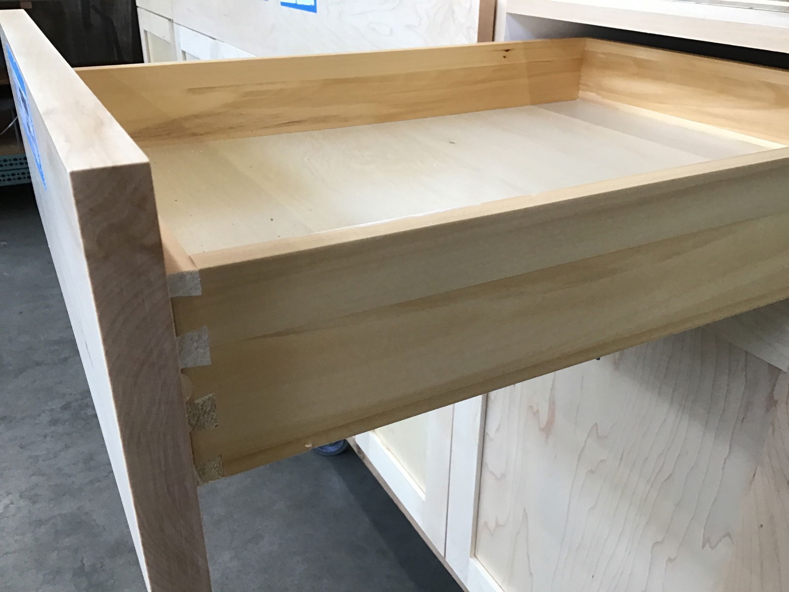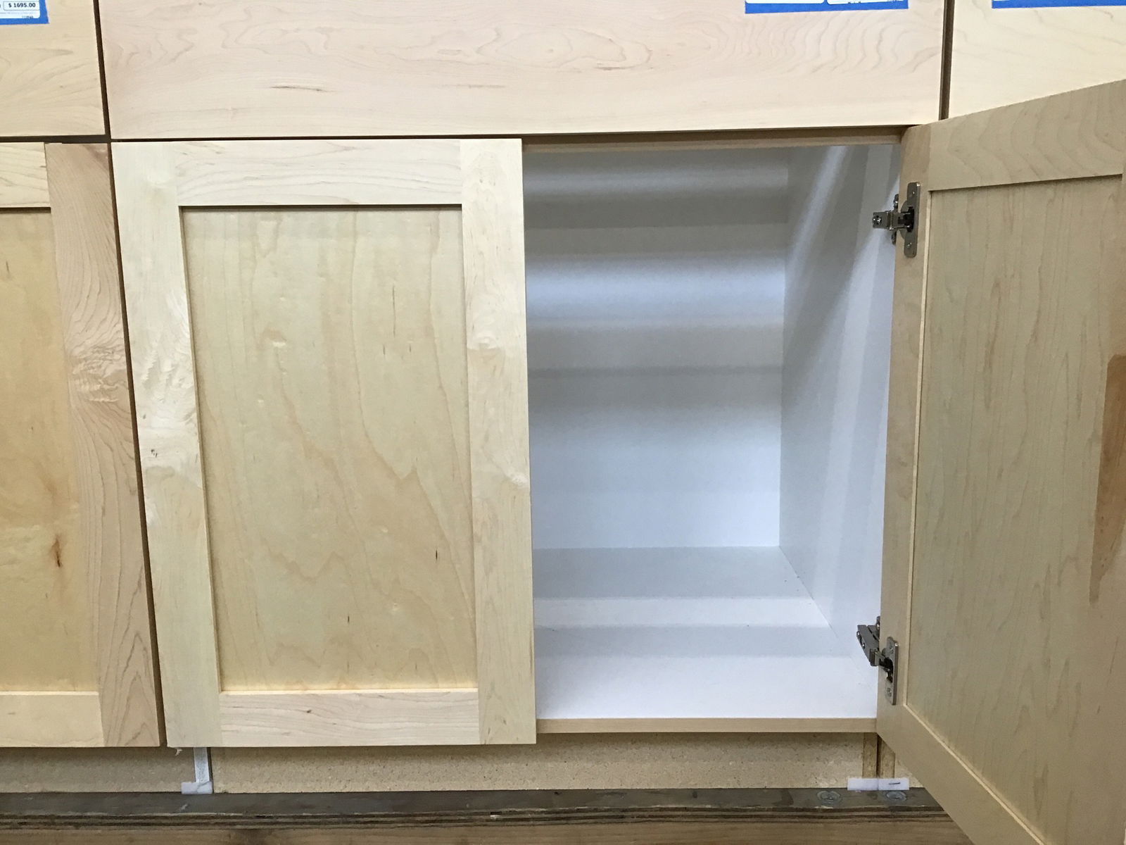This 7 piece shaker style cabinet set came to us fresh out of the box, never having been installed. Each cabinet features a clear finished maple face, soft close hardware, and a really well constructed particle board box. The drawers are all dovetailed & full extension, and behind each door is adjustable shelving. This set is the perfect size for a mother-in-law or cozy kitchen.