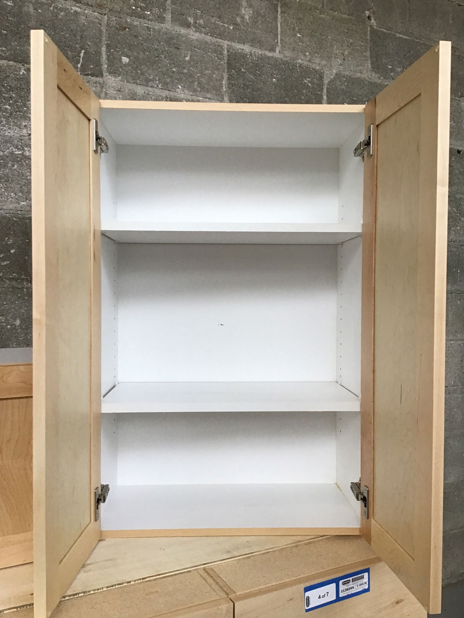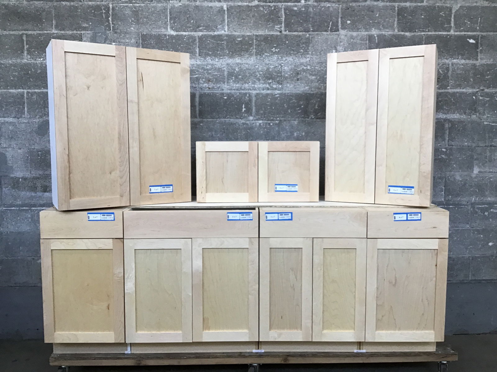 This 7 piece shaker style cabinet set came to us fresh out of the box, never having been installed. Each cabinet features a clear finished maple face, soft close hardware, and a really well constructed particle board box. The drawers are all dovetailed & full extension, and behind each door is adjustable shelving. This set is the perfect size for a mother-in-law or cozy kitchen.