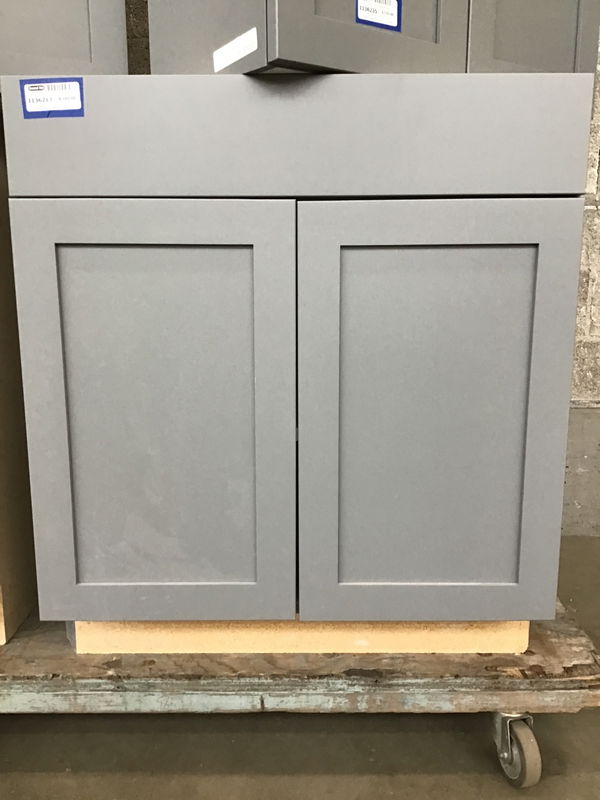 Brand new shaker style base cabinet with a factory dolphin grey paint job, soft close hardware, and a full extension, dovetailed drawer. This is a well constructed cabinet with a classic look - a great option for giving your kitchen or laundry room a fresh look. Does your remodel need a bit more? Check out other items from this job for matching cabinets and more!