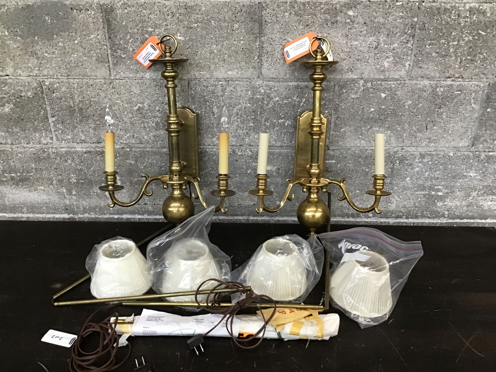 This set includes two Chapman wall sconces, each with a brass wall plate, two brass arms, candle sleeves and mirrored light sockets. These were recently rewired and appeared to function when plugged in. One switch is currently stuck on. Brass tubing is included to hide the cord. Some subtle wear from previous use. Dimensions are per sconce.