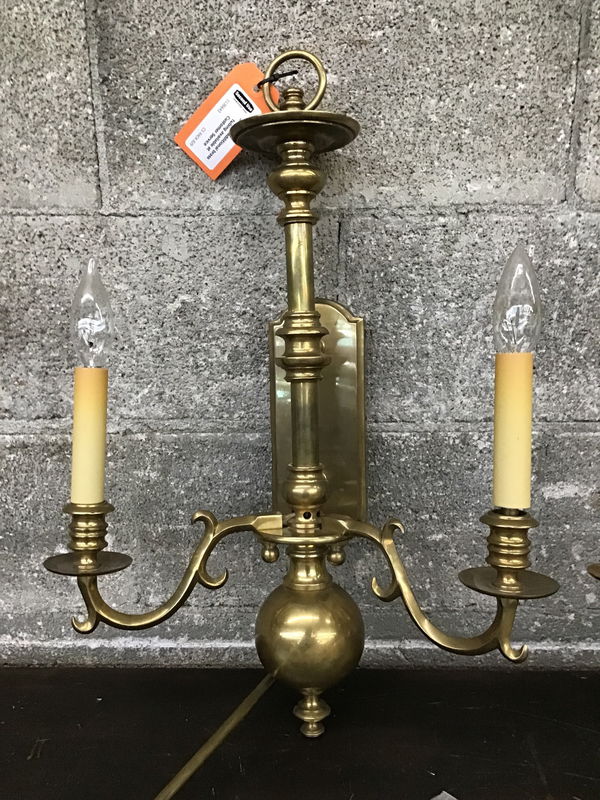This set includes two Chapman wall sconces, each with a brass wall plate, two brass arms, candle sleeves and mirrored light sockets. These were recently rewired and appeared to function when plugged in. One switch is currently stuck on. Brass tubing is included to hide the cord. Some subtle wear from previous use. Dimensions are per sconce.