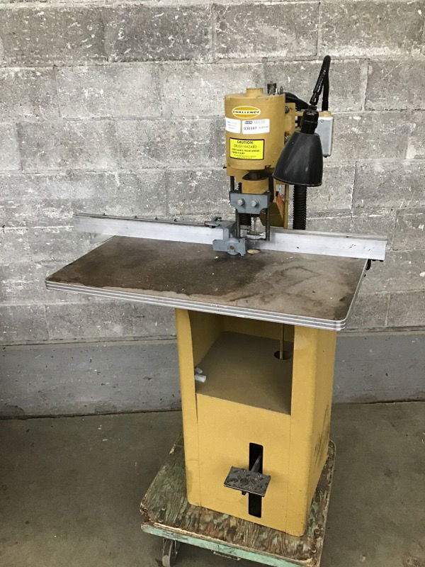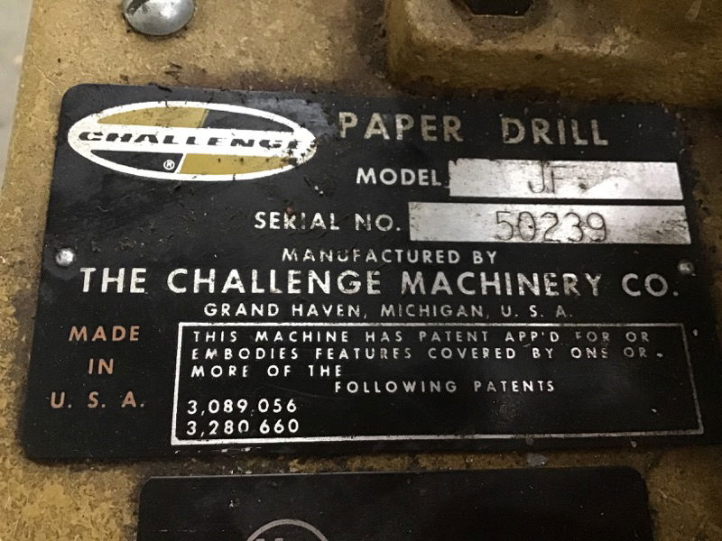 Paper drill press with a sturdy steel cabinet, work light, and fence with adjustable stops. Single spindle w/ 2" depth capacity. The included OD 3/16" hollow bit isn't super sharp but the cabinet foot press and drill motor work well. Made by Challenger. The newest model will run you a few grand new!