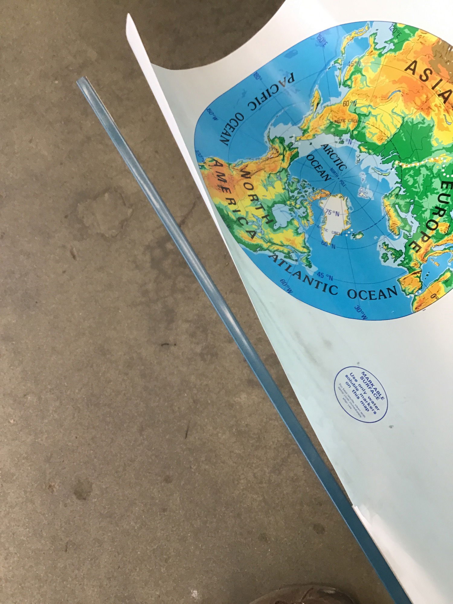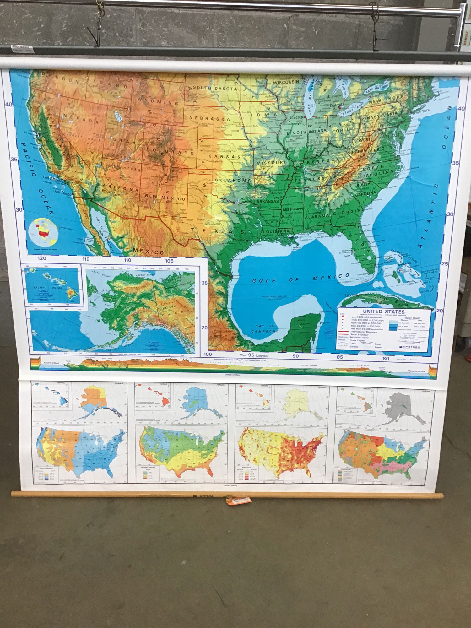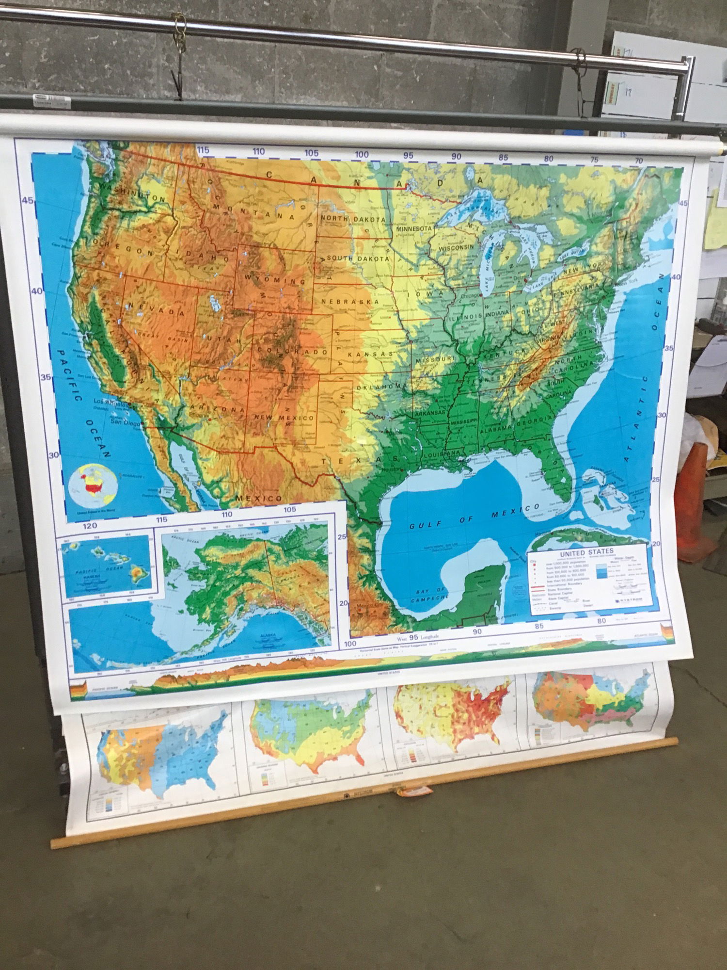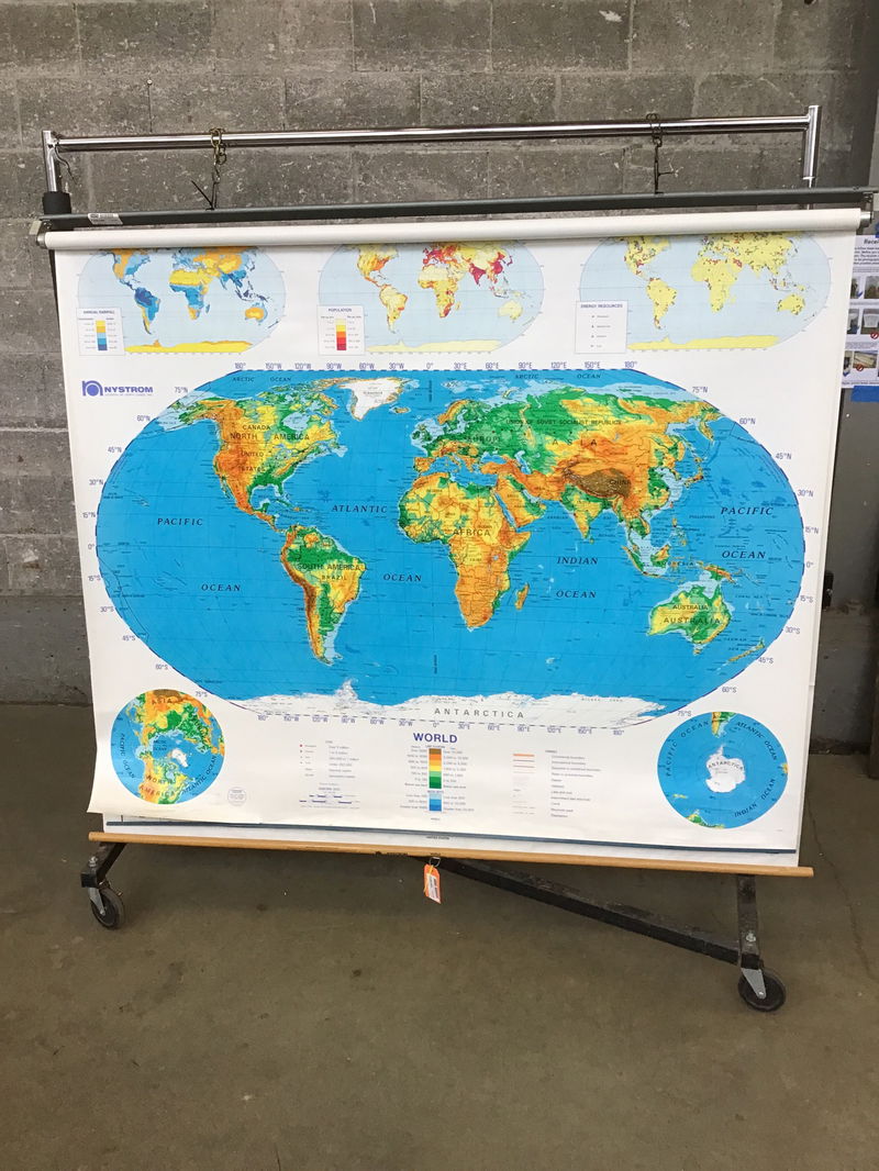 Schoolhouse pulldown map of the world as well as the United States. Great way to decorate a wall! Has a slight tear on the bottom of the world map but nothing too noticeable