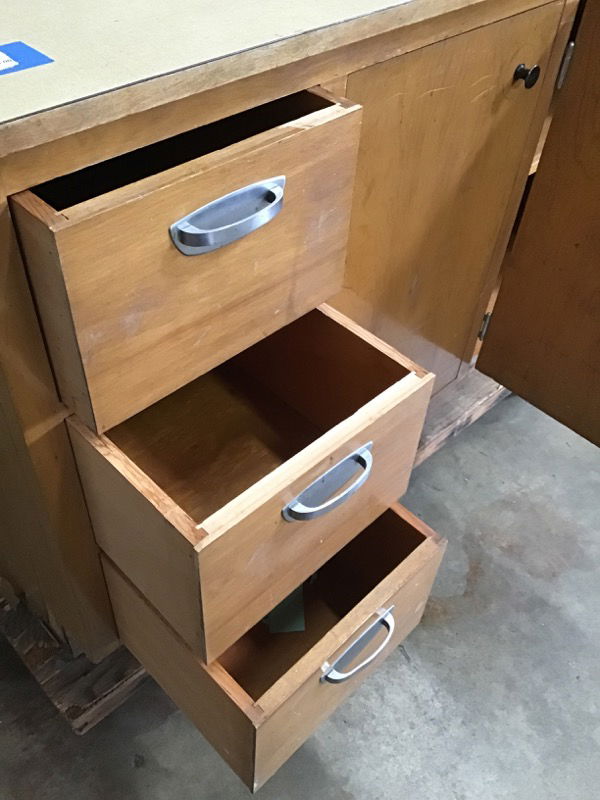 Classic science table, the one you imagine when picturing your school days in the lab. Features Hefty plywood box, four drawers, three shelved compartments, and plastic laminate top.