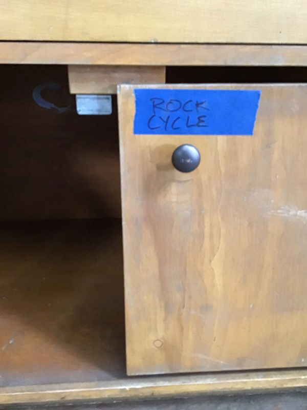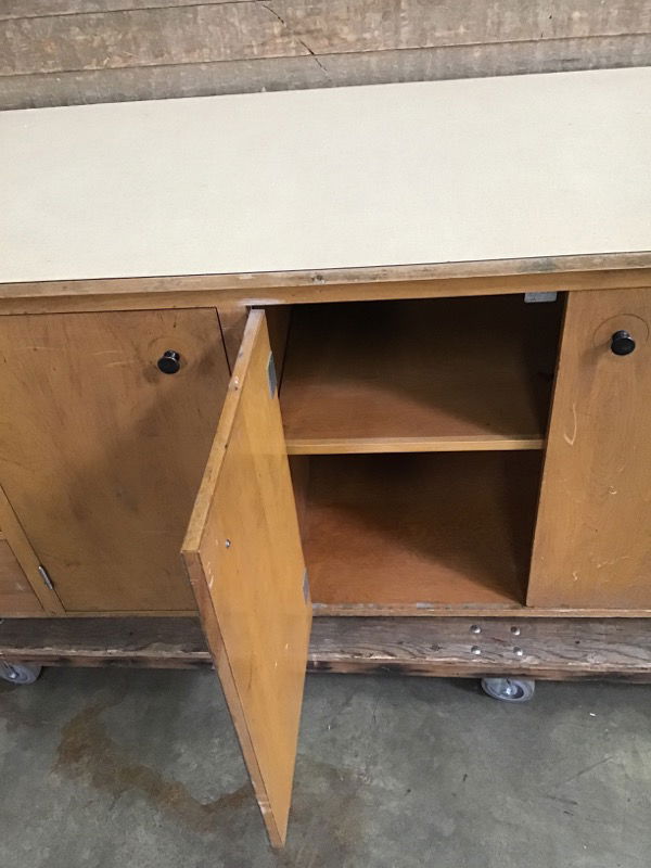 Classic science table, the one you imagine when picturing your school days in the lab. Features Hefty plywood box, four drawers, three shelved compartments, and plastic laminate top.
