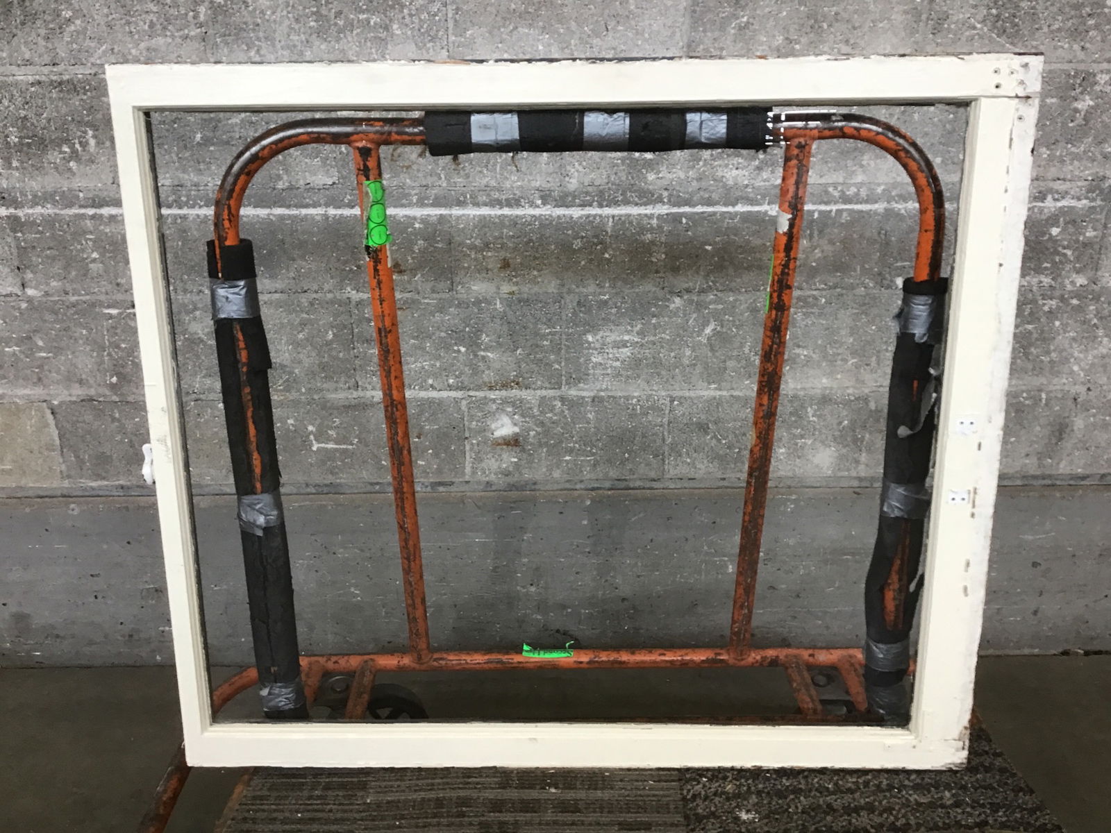 Wooden single pane sash painted white on one side and a dark charcoal on the other. Perfect for a greenhouse or tree house! One rail on the charcoal side is painted a charming green color.