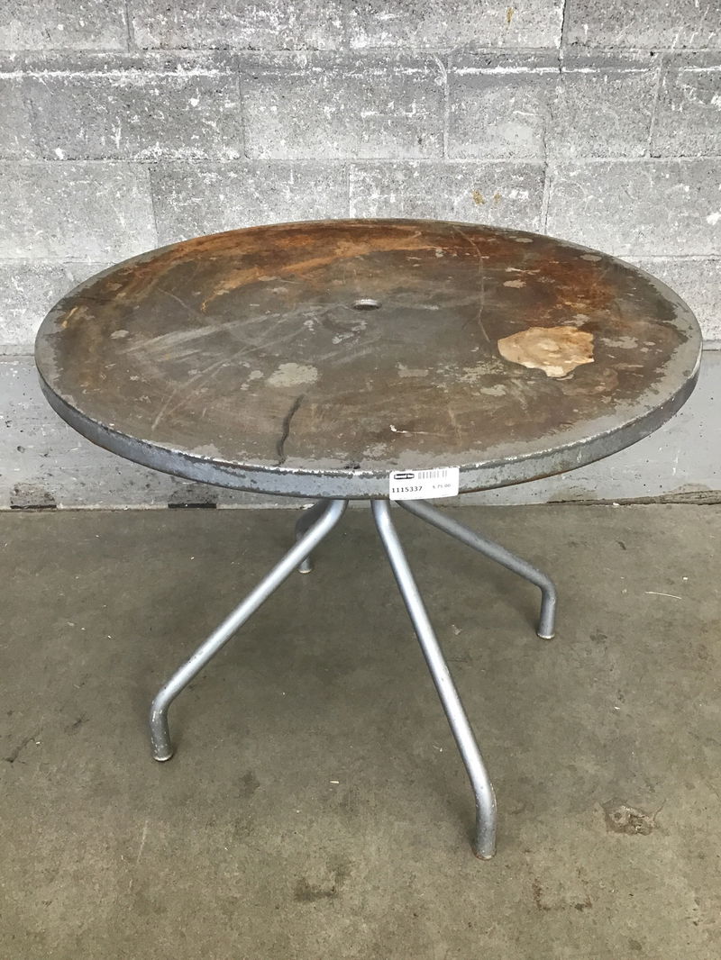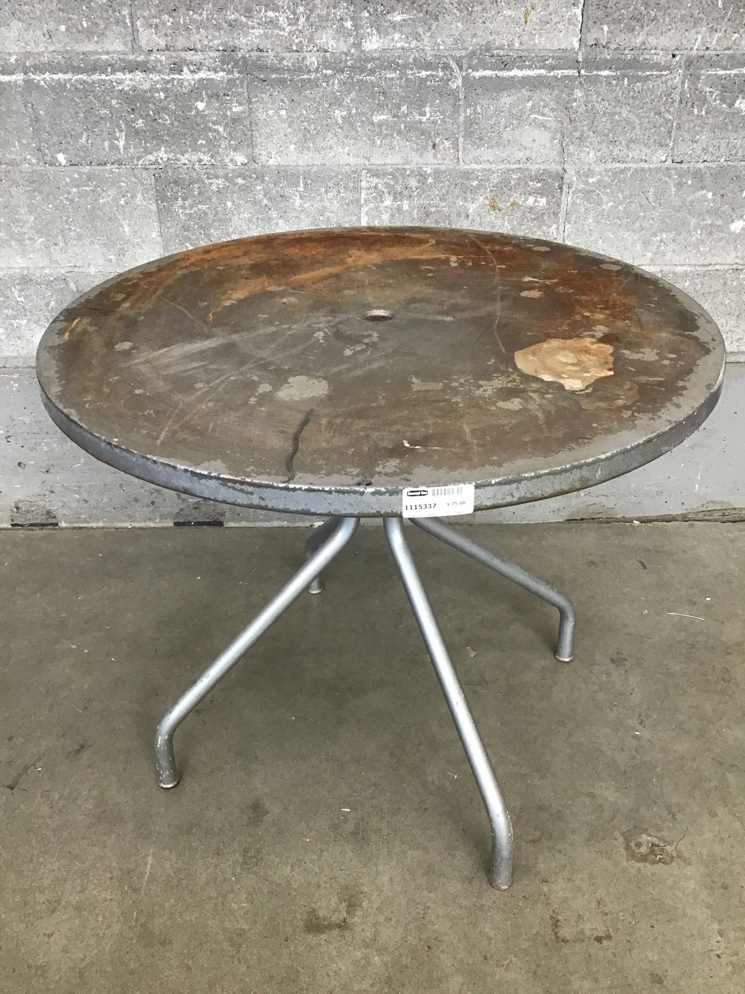4 person steel patio table. The top is worn but overall the table is not damaged and could be repainted or clear coated for a rustic look.