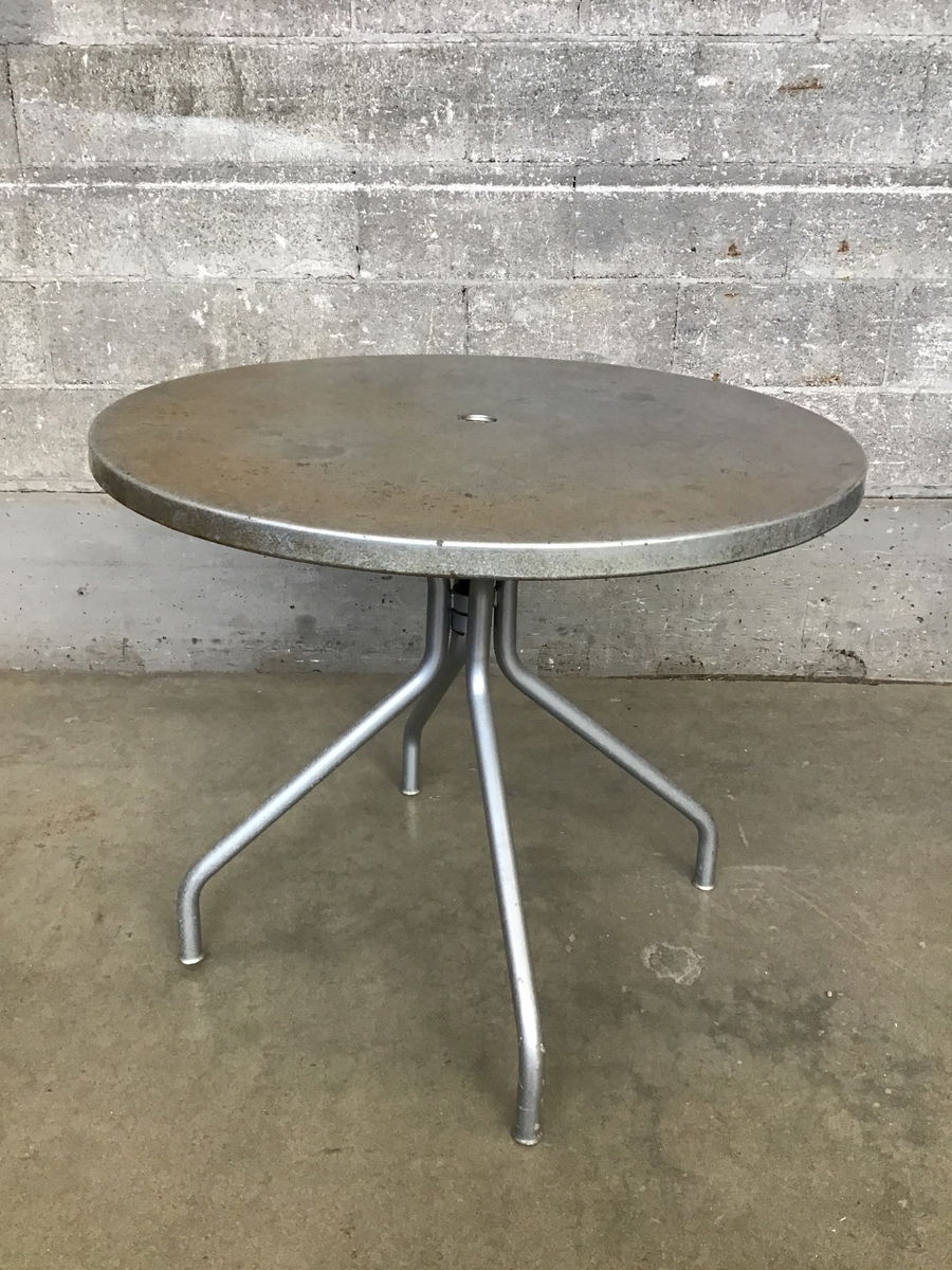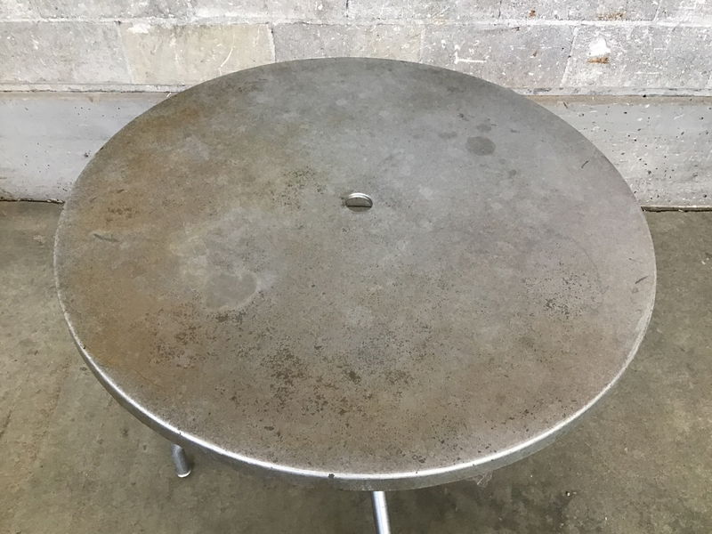 4 person steel patio table. The top is worn but overall the table is not damaged and could be repainted or clear coated for a rustic look.