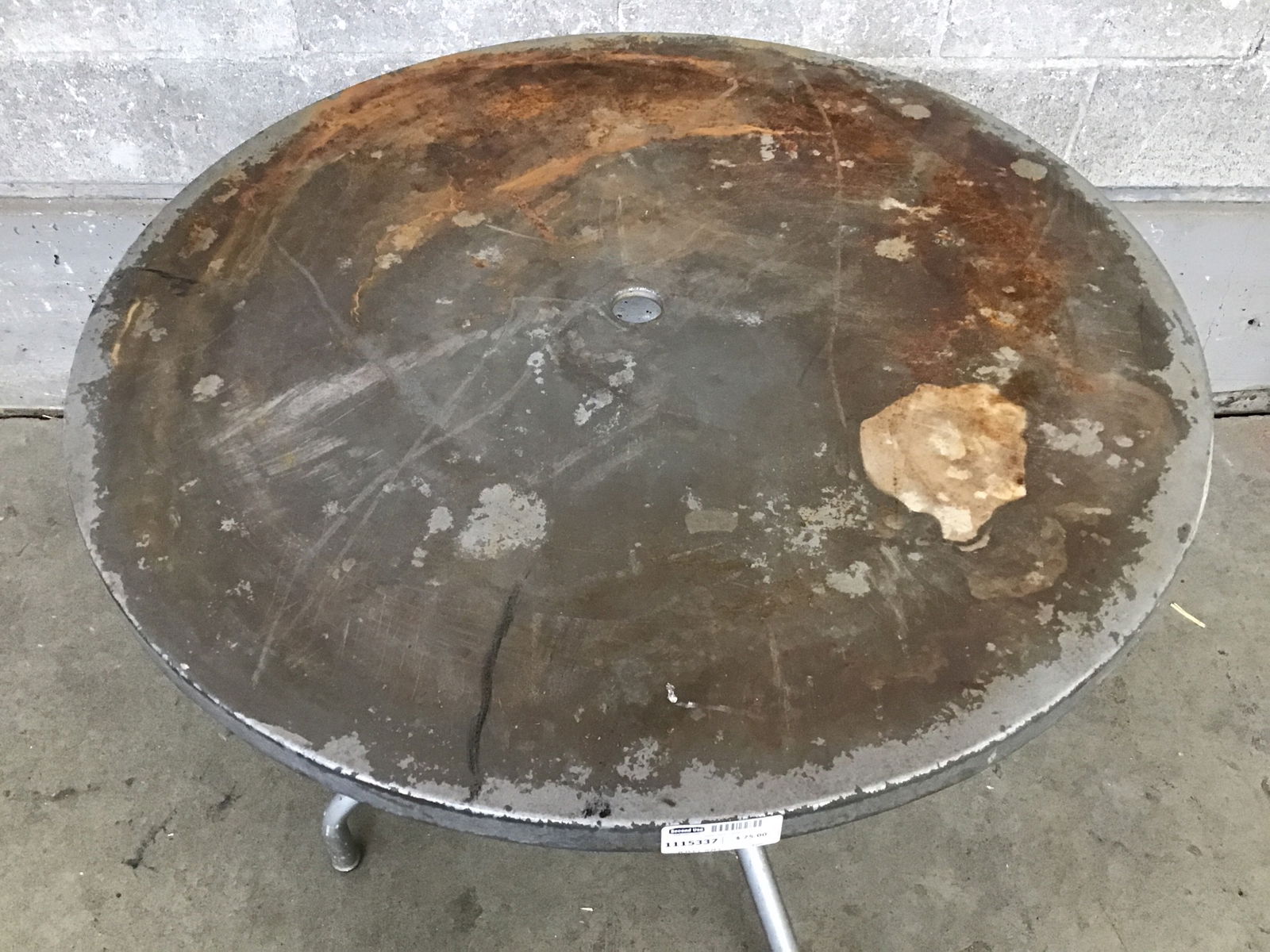 4 person steel patio table. The top is worn but overall the table is not damaged and could be repainted or clear coated for a rustic look.