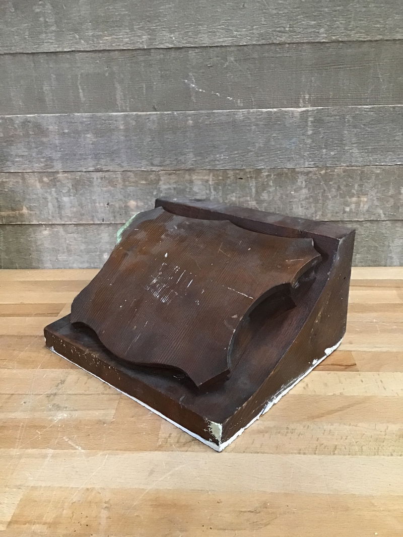 Fir corbel taken out of a church renovation. Large and wide and would look great in a workshop or bar as a ceiling accent. Could also serve as a shelf support. Has some paint and marring from the previous install but still an attractive corbel with a broad-shield shape at the bottom corner.