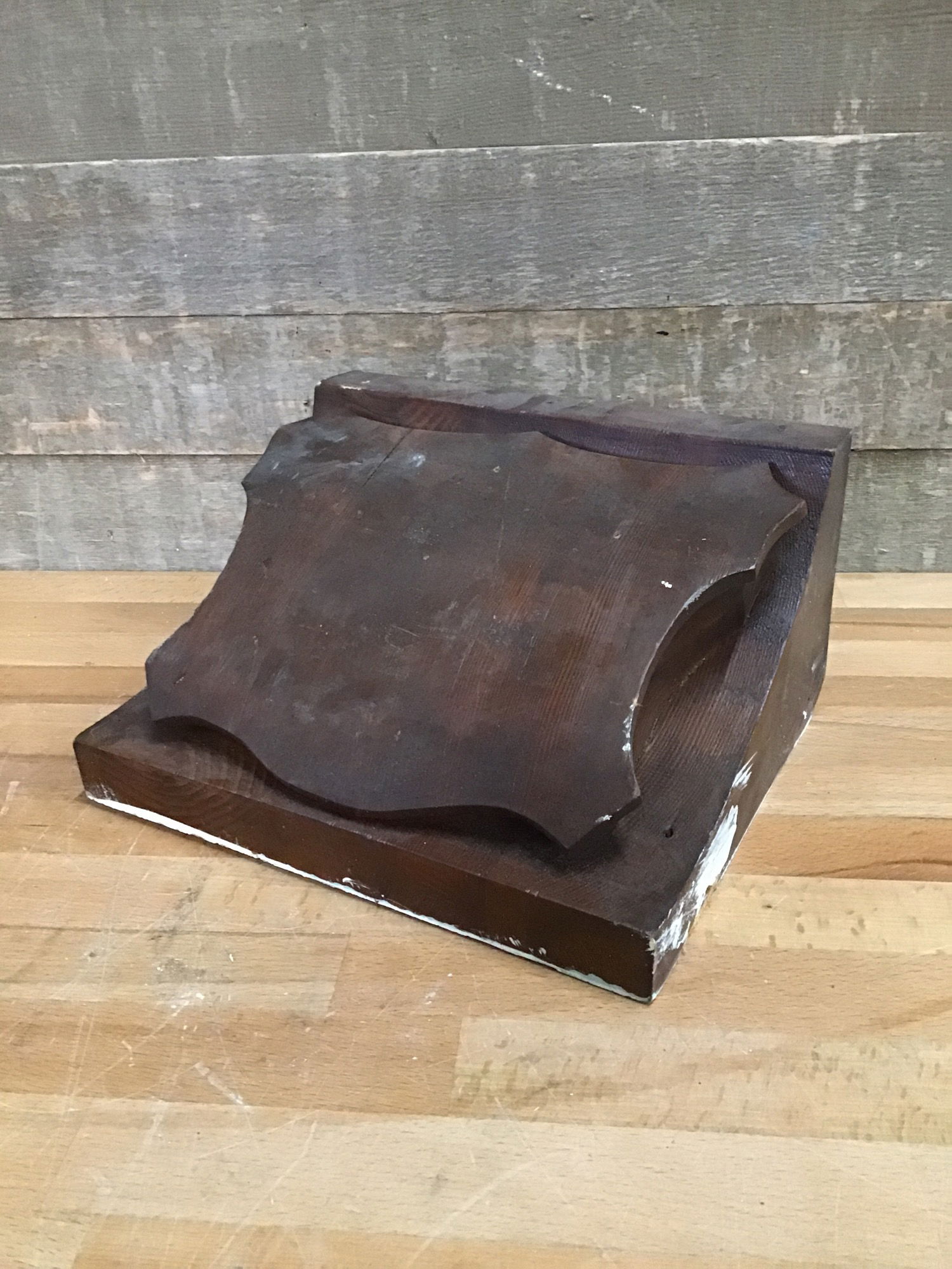 Fir corbel taken out of a church renovation. Large and wide and would look great in a workshop or bar as a ceiling accent. Could also serve as a shelf support. Has some paint and marring from the previous install but still an attractive corbel with a broad-shield shape at the bottom corner.