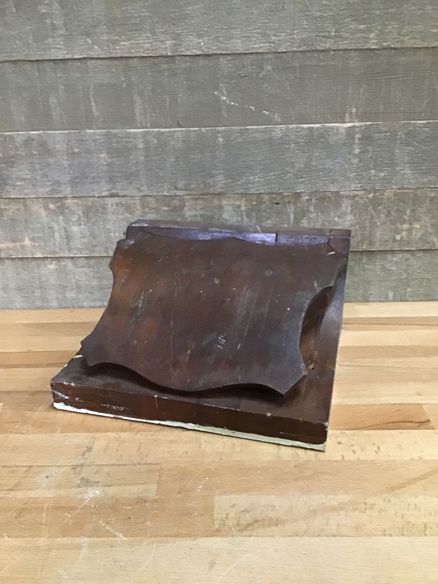 Fir corbel taken out of a church renovation. Large and wide and would look great in a workshop or bar as a ceiling accent. Could also serve as a shelf support. Has some paint and marring from the previous install but still an attractive corbel with a broad-shield shape at the bottom corner.