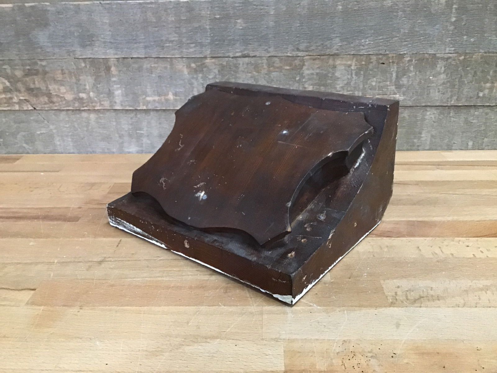 Fir corbel taken out of a church renovation. Large and wide and would look great in a workshop or bar as a ceiling accent. Could also serve as a shelf support. Has some paint and marring from the previous install but still an attractive corbel with a broad-shield shape at the bottom corner.