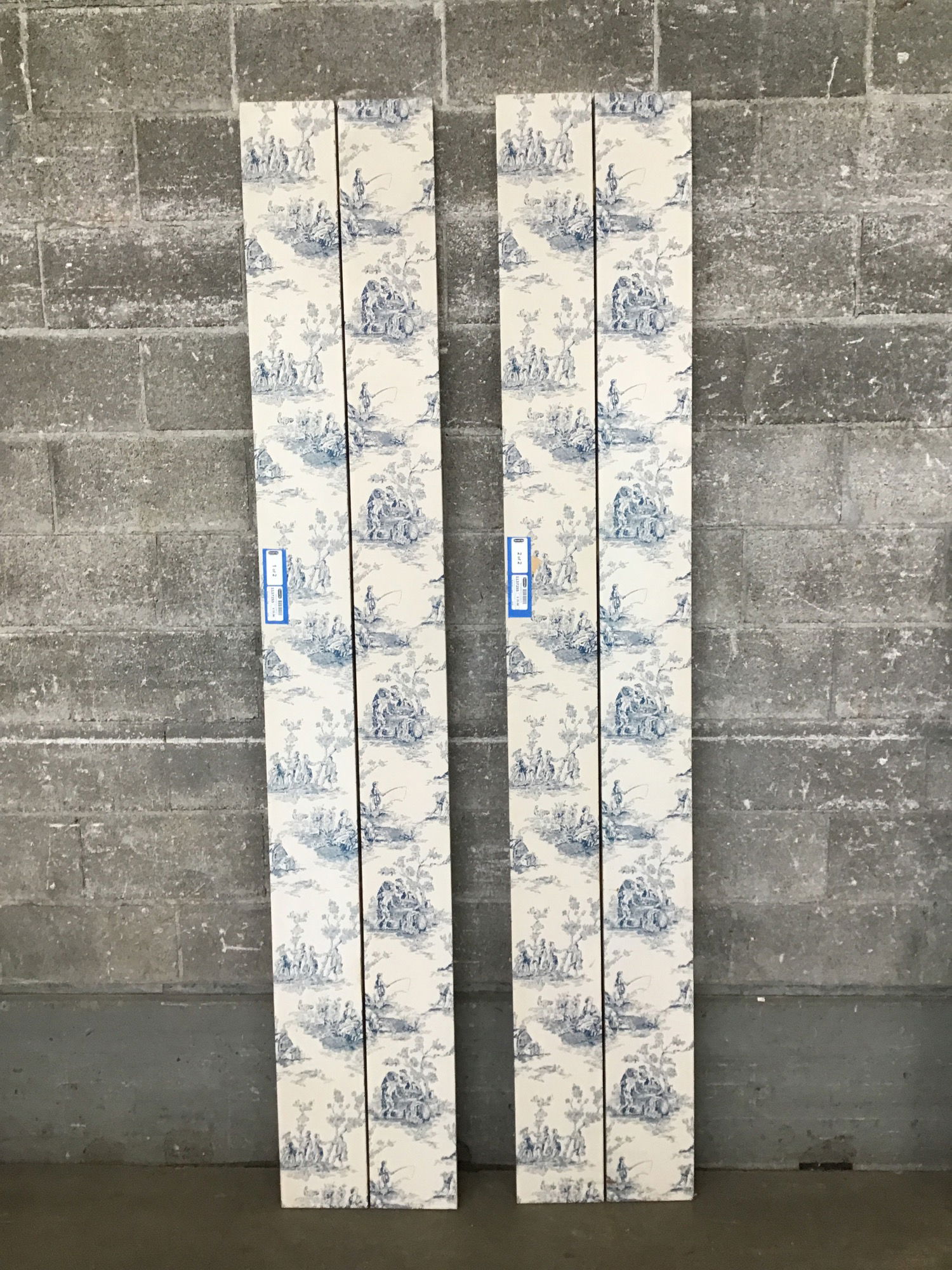 This set includes two extra-tall room dividers. These were previously used to flank either side of a tall window. Each offers two panels, wrapped in a blue and white wallpaper. Some wear to paper. Dimensions are per divider; this set includes two.