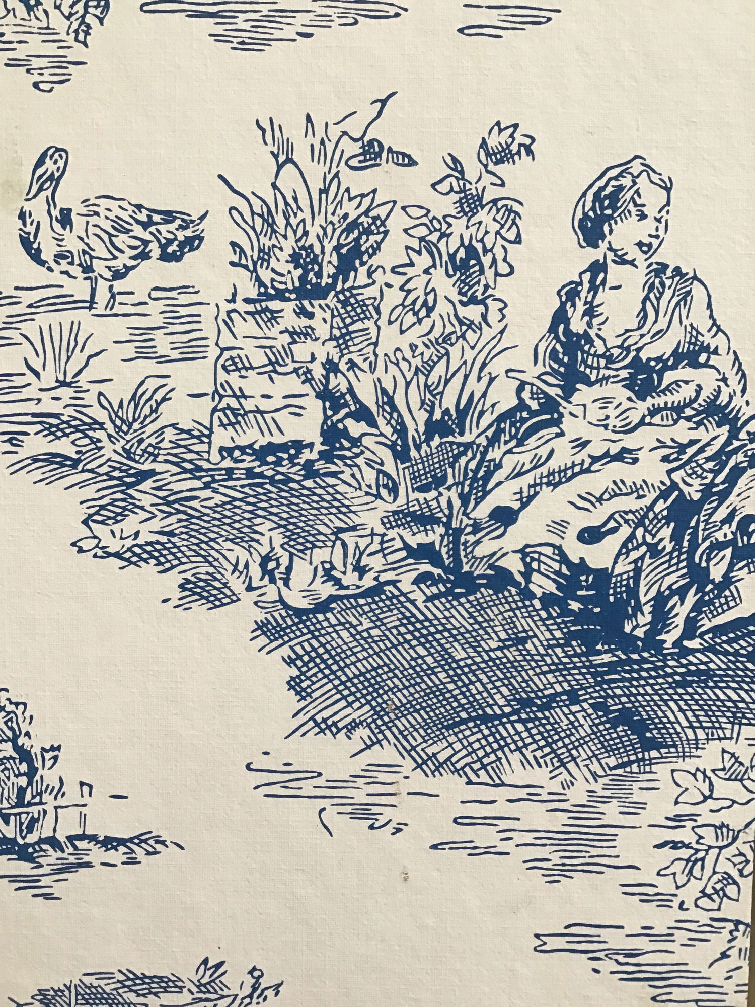 This set includes two extra-tall room dividers. These were previously used to flank either side of a tall window. Each offers two panels, wrapped in a blue and white wallpaper. Some wear to paper. Dimensions are per divider; this set includes two.