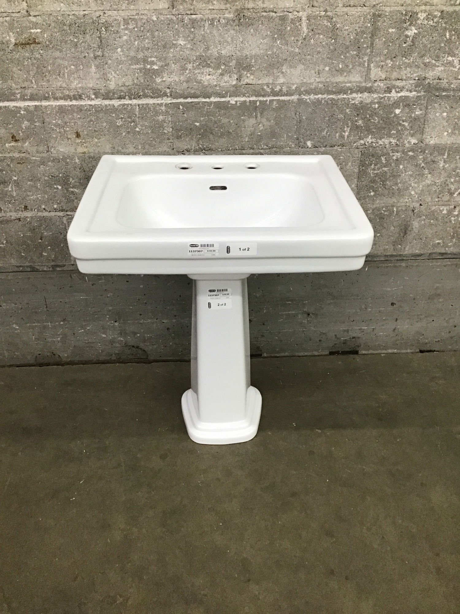 From Toto, this pedestal sink features a ceramic body, a glossy white enamel and a rimmed countertop for setting down your soaps and such. Some caulking from previous installation.