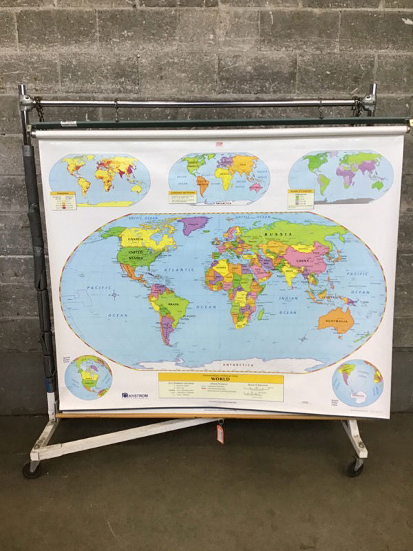 Marked World map in front with unlabeled World & United States maps (three total) on one reel. Seems to function as it should, but does show some cosmetic damage. Has markable surface. Made by Nystrom.