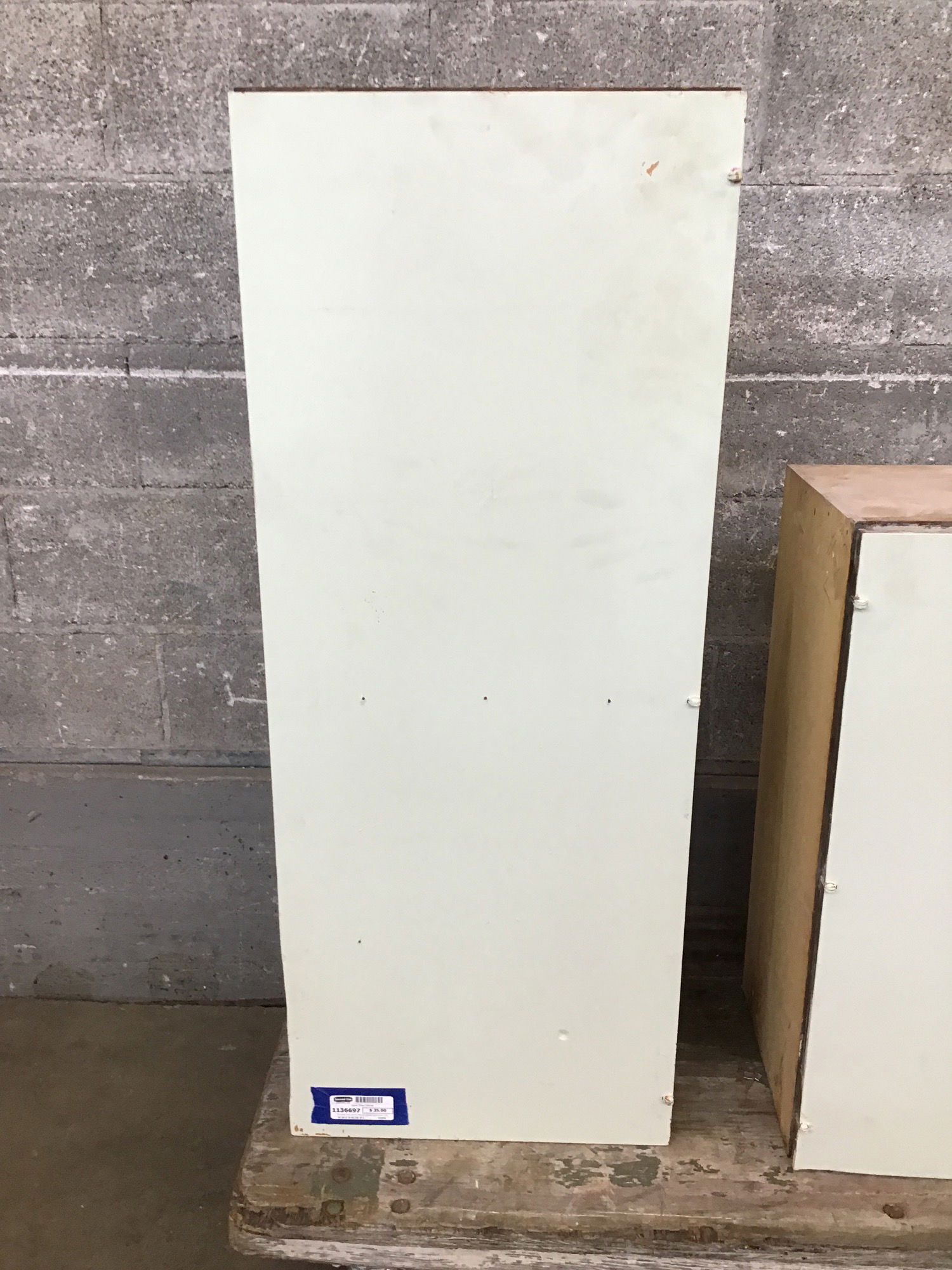 This upper shop cabinet features plywood construction, a flush face door and two adjustable shelves. This cabinet has been painted multiple times, but would still be helpful storage in a shop.