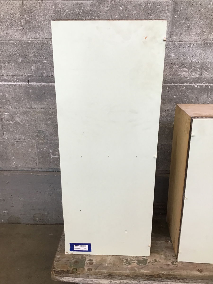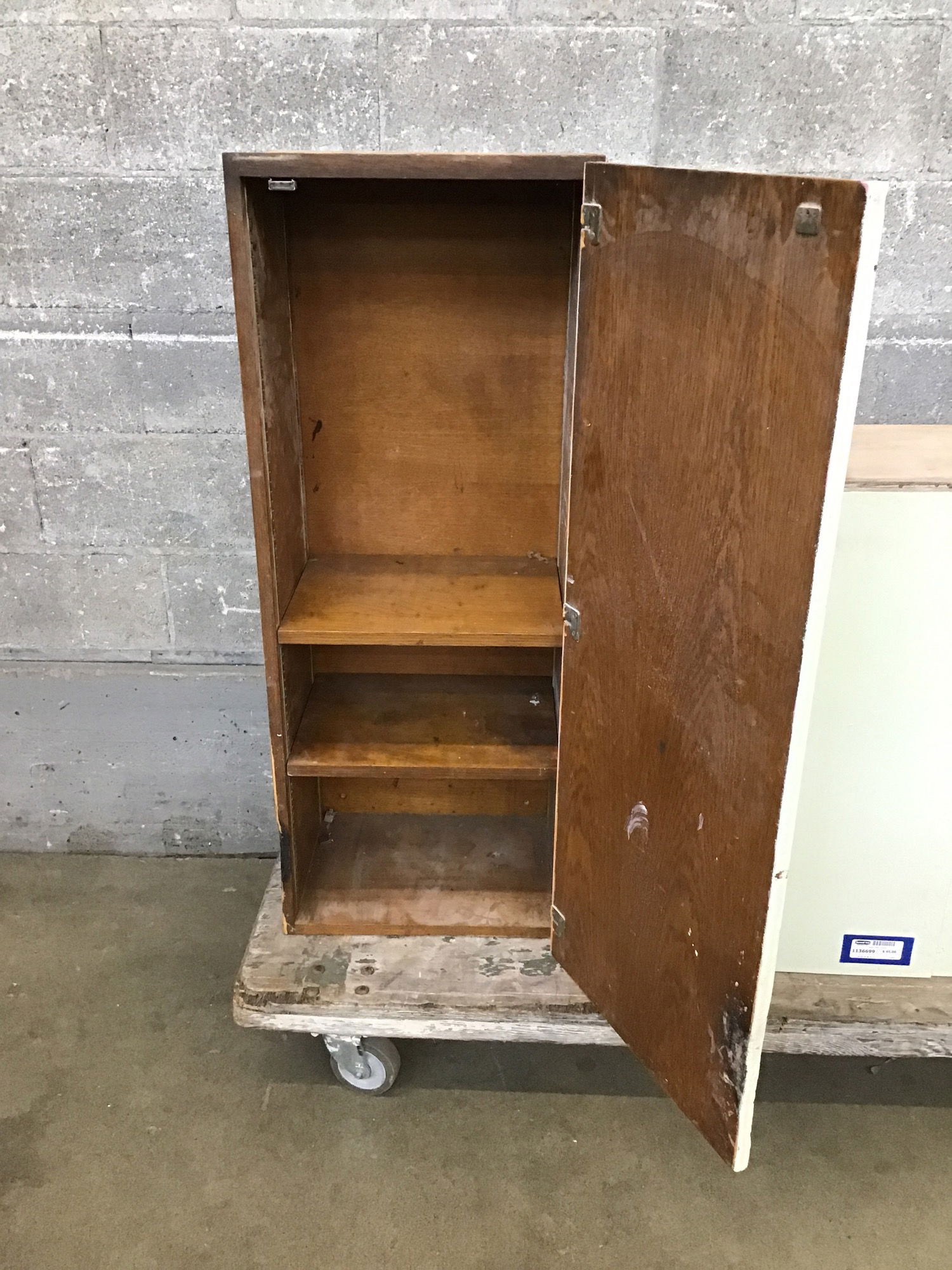 This upper shop cabinet features plywood construction, a flush face door and two adjustable shelves. This cabinet has been painted multiple times, but would still be helpful storage in a shop.