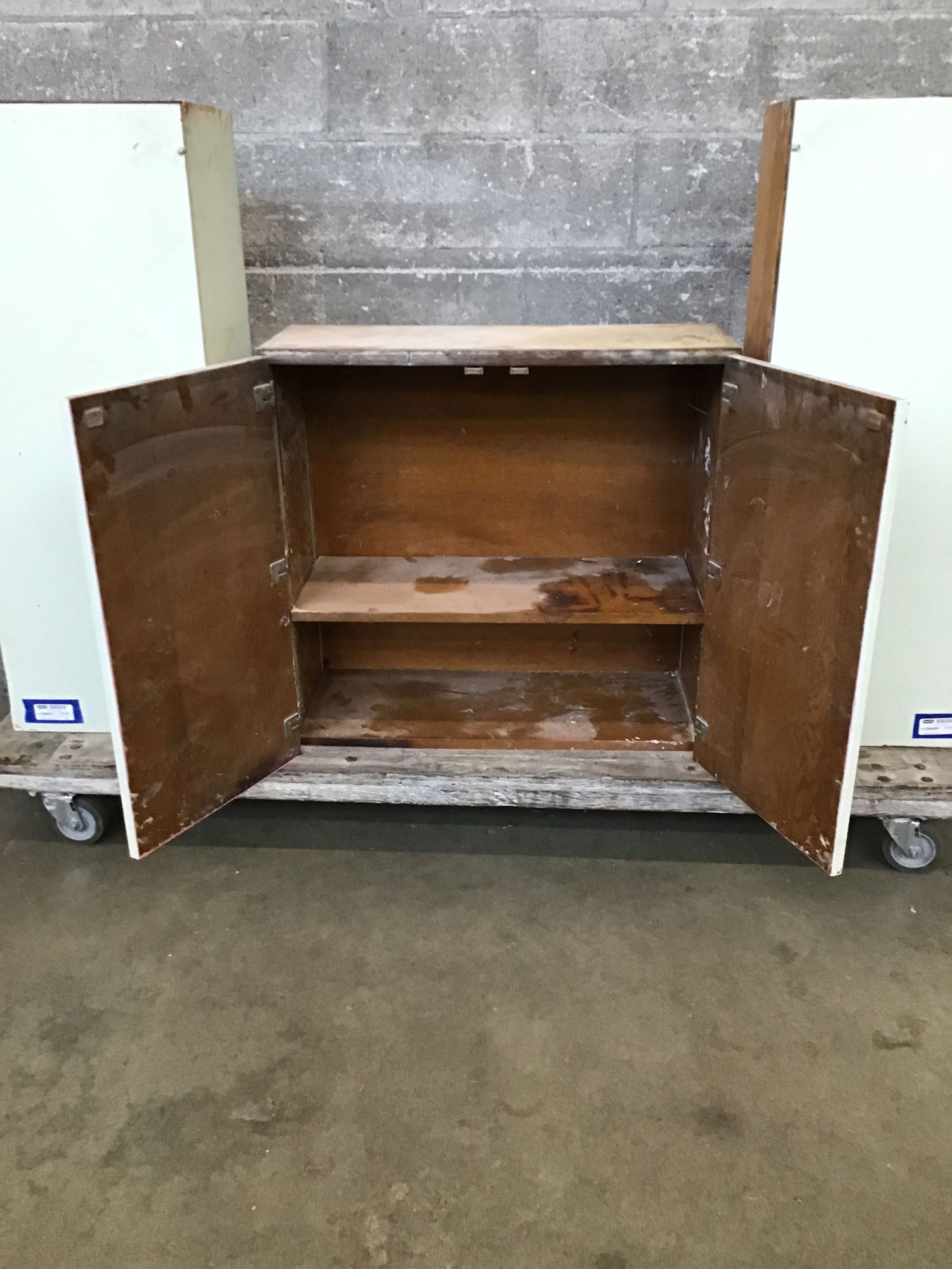This upper shop cabinet features plywood construction, two flush face doors and an adjustable shelf. This cabinet has been painted multiple times, but would still be helpful storage in a shop.